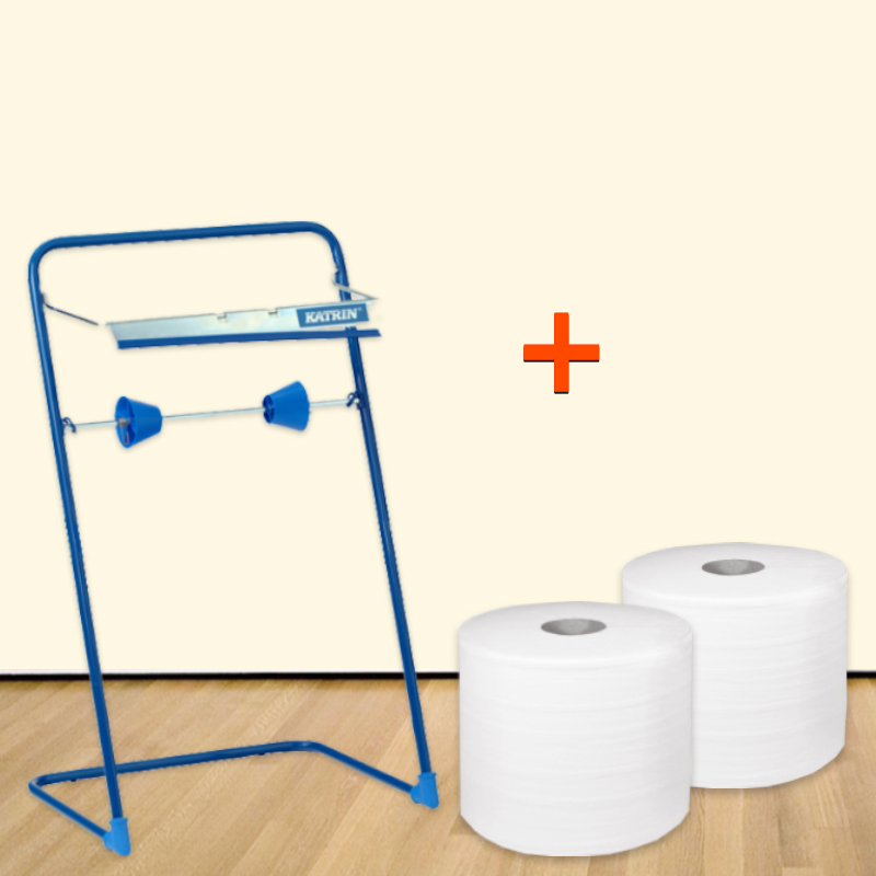 Výhodné balenie, podlahový stojan + 2kot utierok. Univerzálny podlahový kovový stojan (obj. 709141), odvinovač na utierky v kotúči s max. priemerom 33 cm. 2ks kotúčov 2 vrst. papierových utierok s ražbou (obj. kód 60154) sú súčasťou balenia. Návin 24cm x 304m
