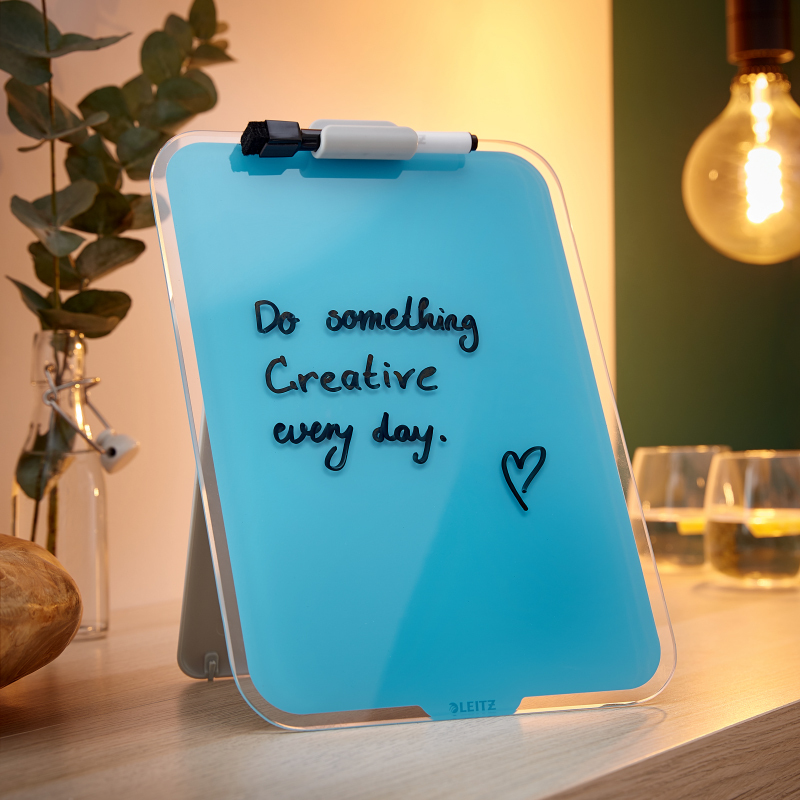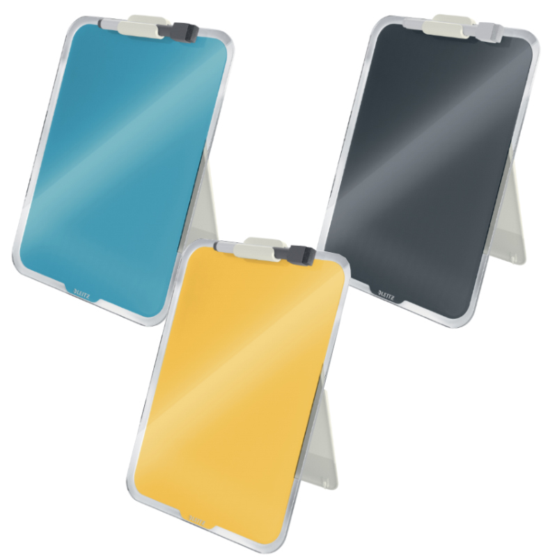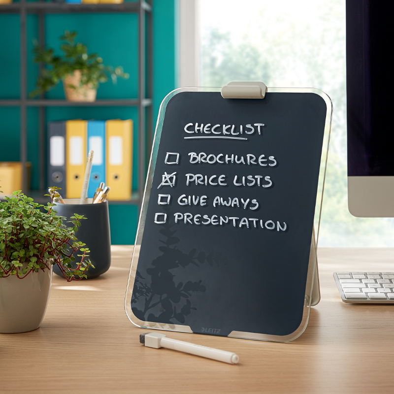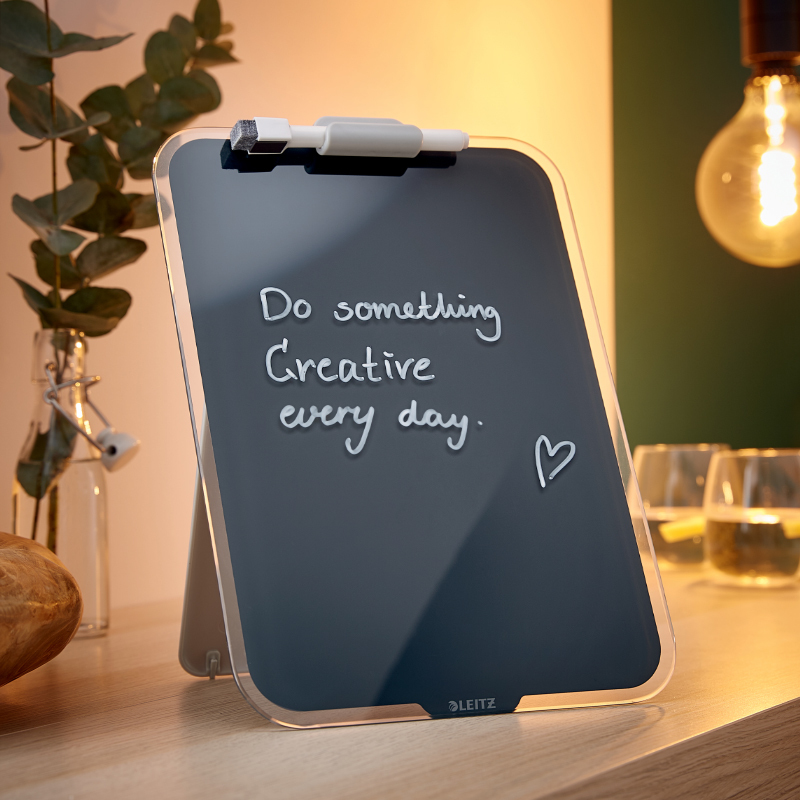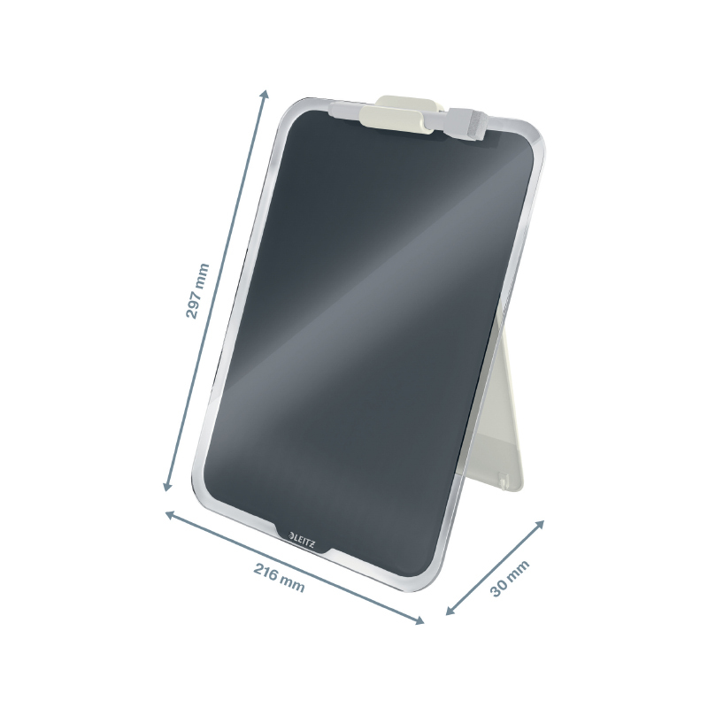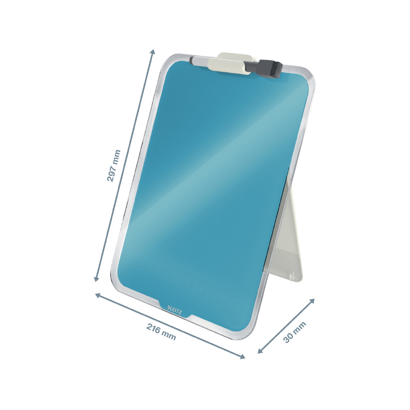 Stolný sklenený flipchart Leitz Cosy je unikátny nástroj na písanie poznámok, alebo nalepovanie správ a odkazov. Pamätá si za vás, pomôže vám pracovať efektívne celý deň. Kompaktný A4 stojan sa pohodlne zmestí na pracovný stôl alebo kdekolvek doma, aby bol pred očami. Má integrovaný držiak na popisovač s zotieracou gumou. Popisovačom na biele tabule jednoducho napíšete dôležité odkazy alebo informácie ktoré kedykoľvek zotrete a môžete písať znova. Je vyrobená z bezpečnostného tvrdeného skla s vynikajúcou stierateľnosťou a najvyššou odolnosťou proti fľakom, škvrnám od atramentu, škrabancom a preliačinám. Vyžaduje občasné dôkladné vyčistenie, aby sklenený povrch tabule zostal v najlepšej kondícii. Táto prémiová magnetická sklenená tabuľa je perfektným doplnkom vášho domova alebo kancelárie. Kolekcia Leitz Cosy kombinuje komfort domáceho pohodlia s prvotriednou kvalitou a vytvára tak pozitívne a produktívne pracovné prostredie. Rozmery 216 x 30 x 297 (mm)