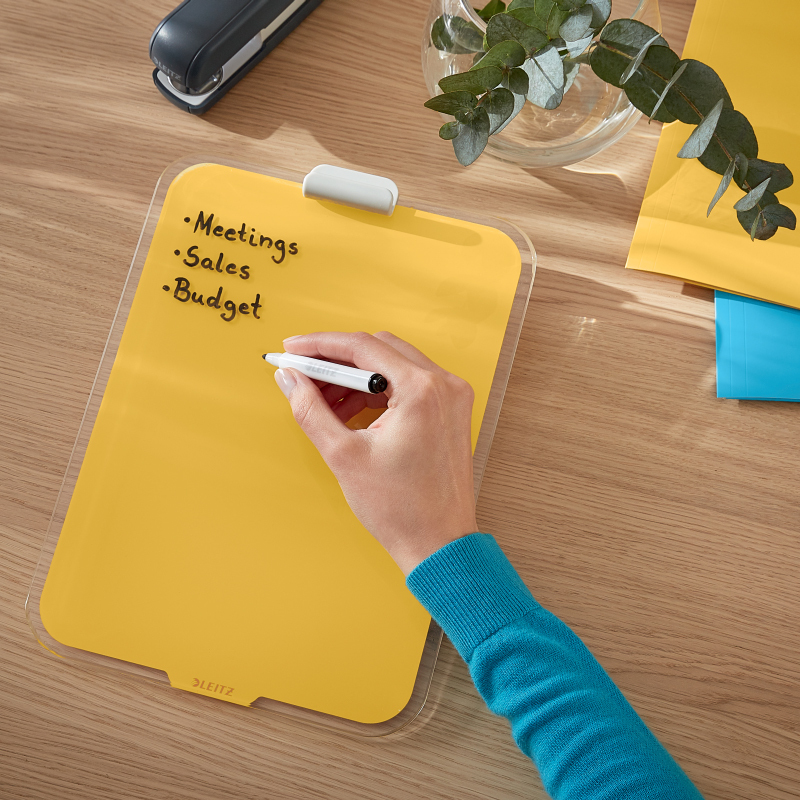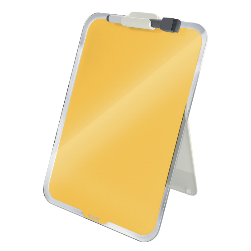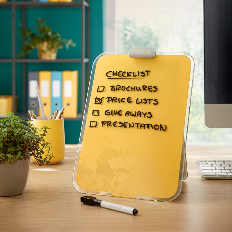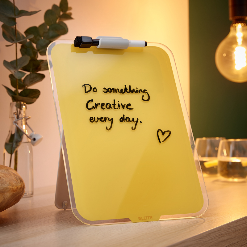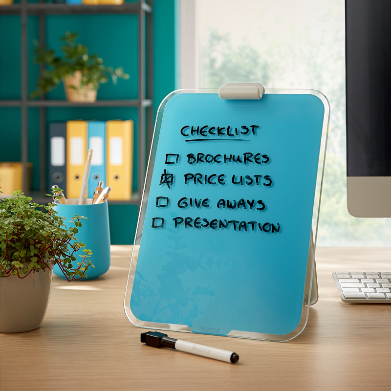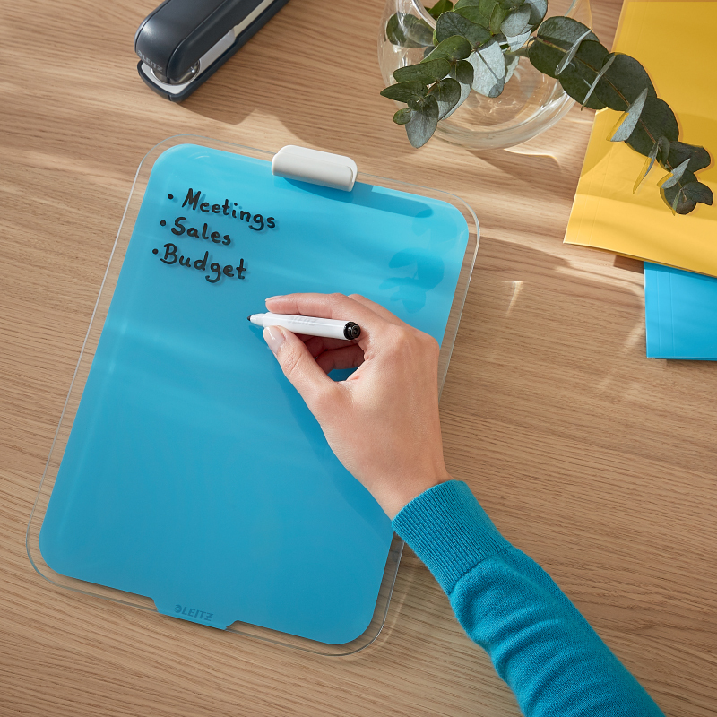 Stolný sklenený flipchart Leitz Cosy je unikátny nástroj na písanie poznámok, alebo nalepovanie správ a odkazov. Pamätá si za vás, pomôže vám pracovať efektívne celý deň. Kompaktný A4 stojan sa pohodlne zmestí na pracovný stôl alebo kdekolvek doma, aby bol pred očami. Má integrovaný držiak na popisovač s zotieracou gumou. Popisovačom na biele tabule jednoducho napíšete dôležité odkazy alebo informácie ktoré kedykoľvek zotrete a môžete písať znova. Je vyrobená z bezpečnostného tvrdeného skla s vynikajúcou stierateľnosťou a najvyššou odolnosťou proti fľakom, škvrnám od atramentu, škrabancom a preliačinám. Vyžaduje občasné dôkladné vyčistenie, aby sklenený povrch tabule zostal v najlepšej kondícii. Táto prémiová magnetická sklenená tabuľa je perfektným doplnkom vášho domova alebo kancelárie. Kolekcia Leitz Cosy kombinuje komfort domáceho pohodlia s prvotriednou kvalitou a vytvára tak pozitívne a produktívne pracovné prostredie. Rozmery 216 x 30 x 297 (mm)