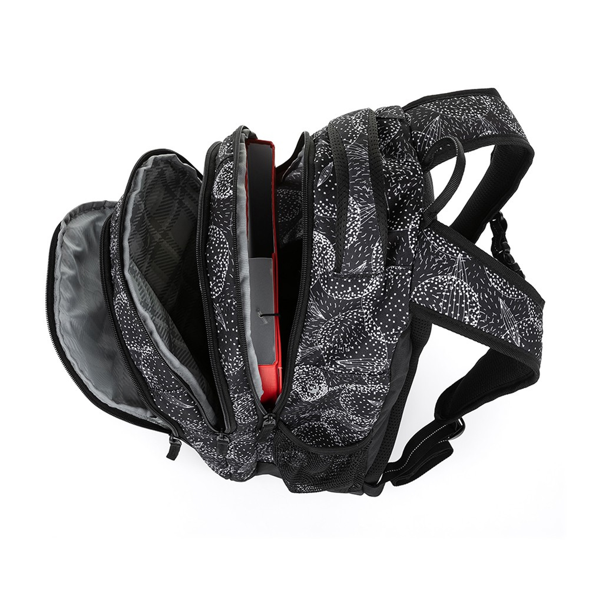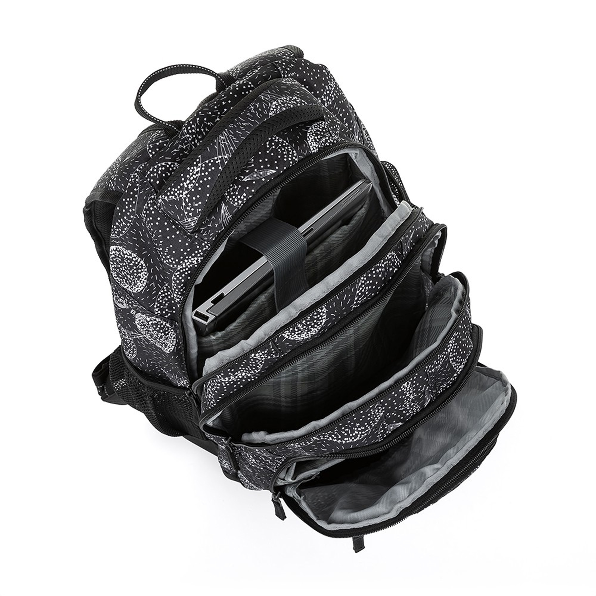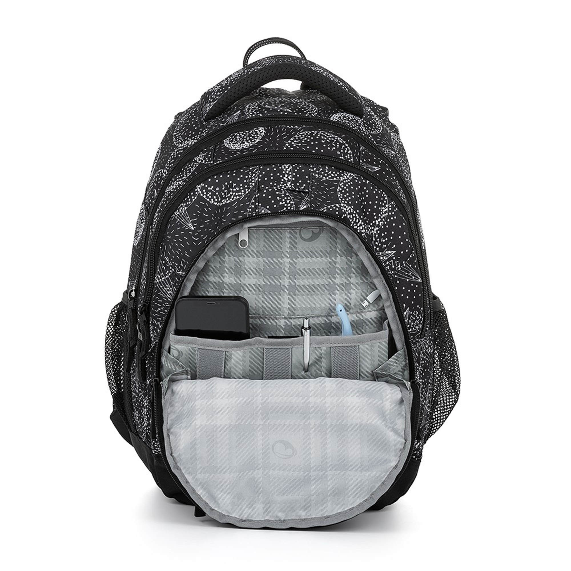 Batoh má tri hlavné priehradky. Hlavná komora je veľmi priestranná a pojme aj učebnice formátu A4. Stredná priehradka je vhodná na formát A4 a obsahuje vrecko na desiatu. Predná priehradka má praktický organizér na mobilný telefón, slúchadlá a písacie potreby. Bočné sieťované vrecká sú ideálne na fľašu s pitím. Polstrované vrecko v hlavnej priehradke je určené na tablet alebo notebook do veľkosti 15".
