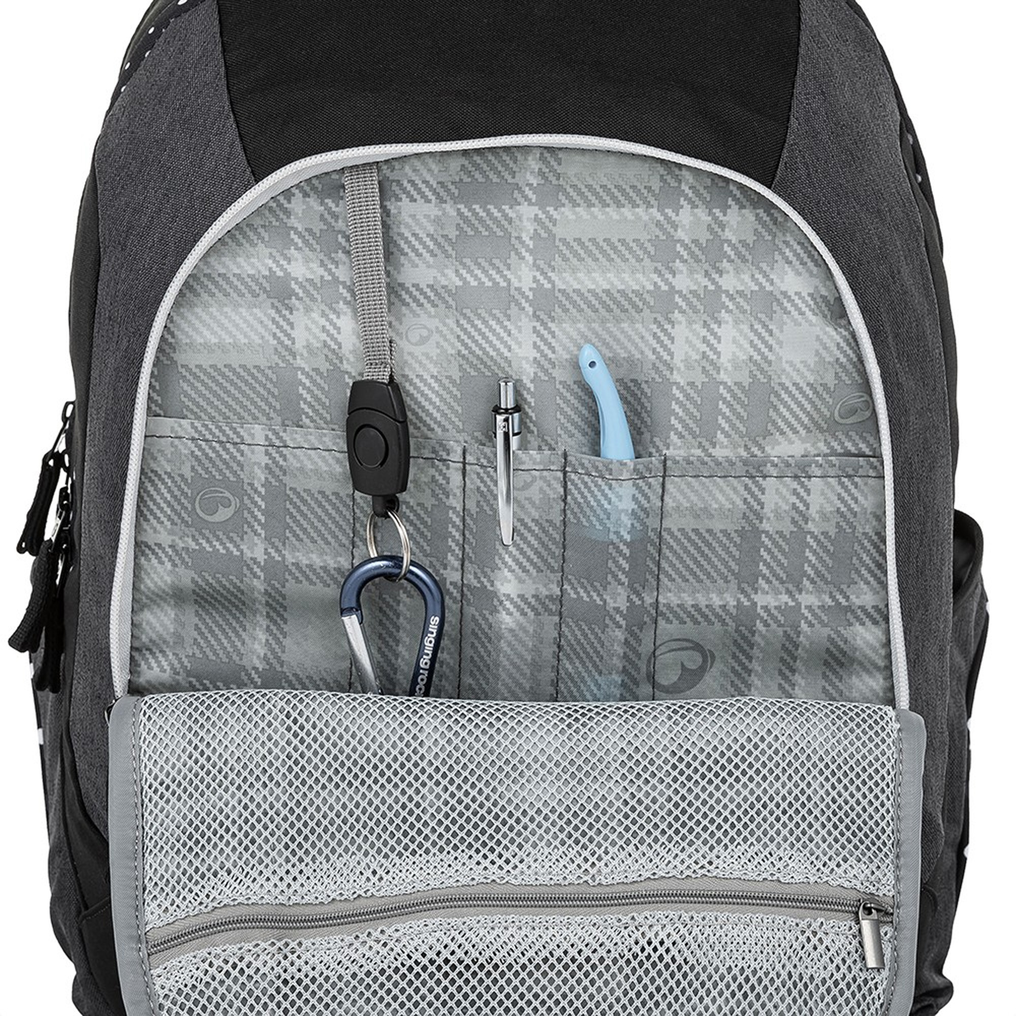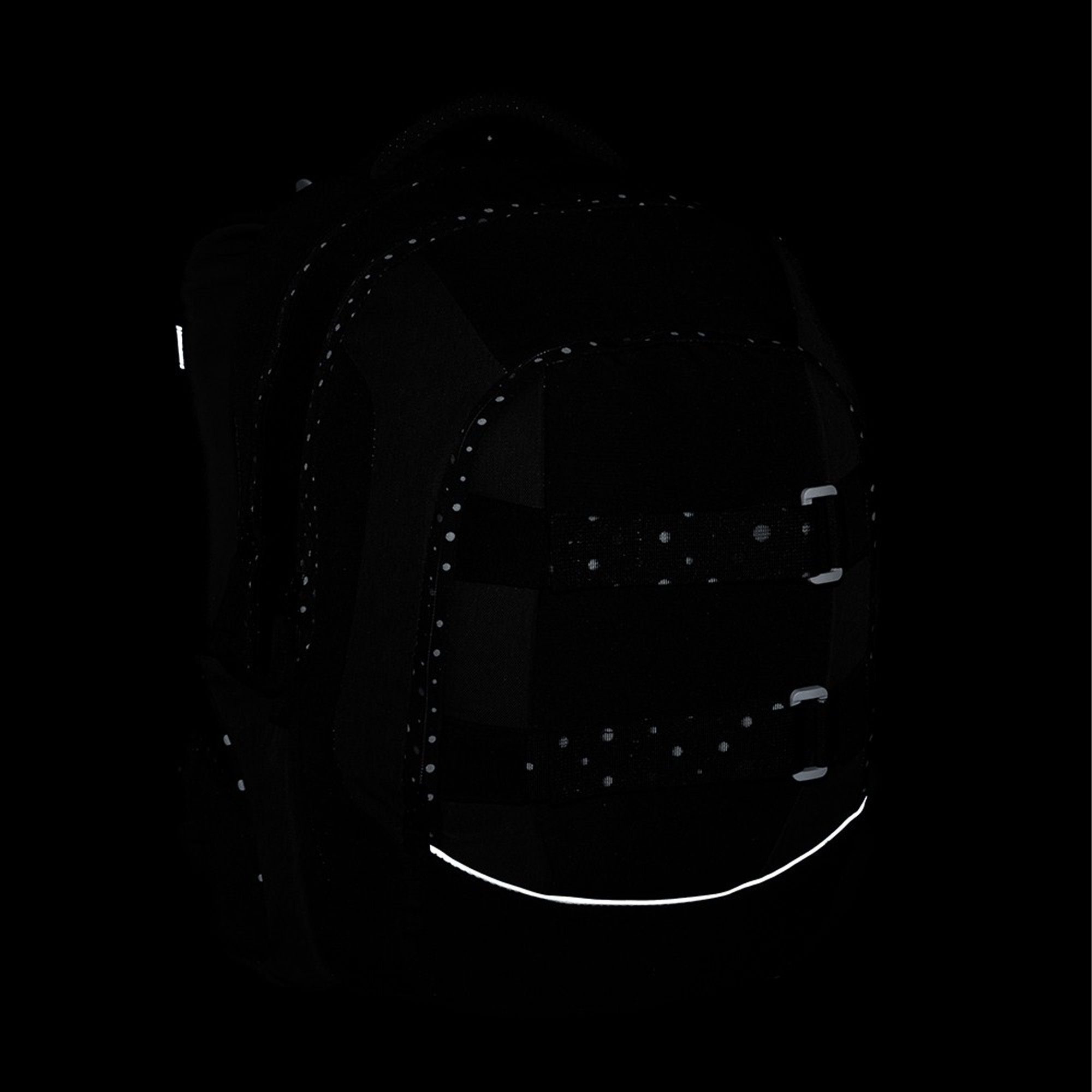 Batoh obsahuje hrudný pás pre väčšiu stabilitu. Hlavná priehradka je vhodná na zakladače a formát A4, predná komora má praktický organizér s vreckami a pútkom. Bočné vrecká sú na fľašu s nápojom a malé vrecko na zips je určené na drobnosti. Pevné dno s nožičkami zabezpečuje, že batoh stojí pevne a nešpiní sa. Reflexné prvky zaisťujú bezpečnosť za každého počasia. Na hornej strane je rukoväť a pútko na zavesenie.