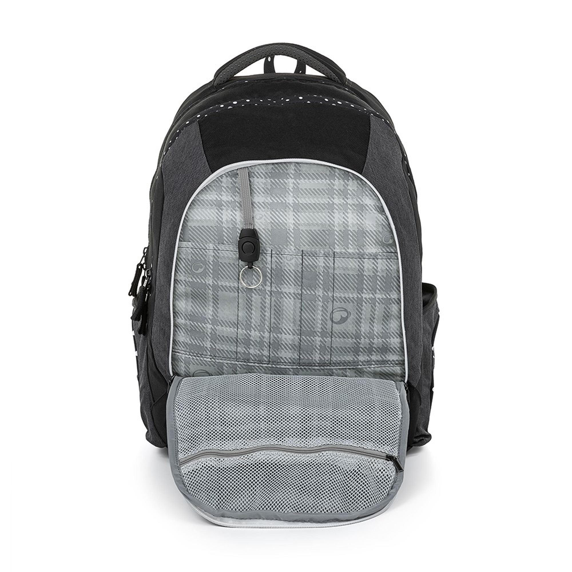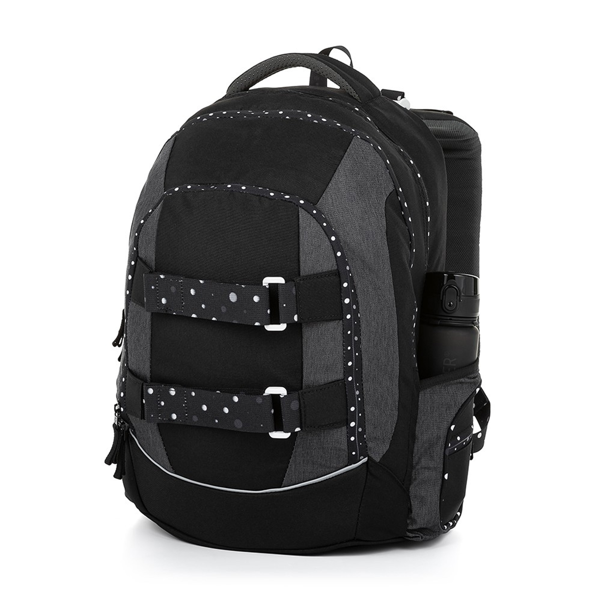 Čiernobiely batoh Flick je ideálny pre dievčatá od 4. triedy. Má tri veľké priehradky na školské potreby, anatomické tvarovanie a mäkké polstrovanie chrbta s 3D sieťovinou pre pohodlné nosenie. Vzorované ramenné popruhy sú nastaviteľné a prispôsobené na citlivé chrbty dievčat, s možnosťou upevnenia skateboardu.