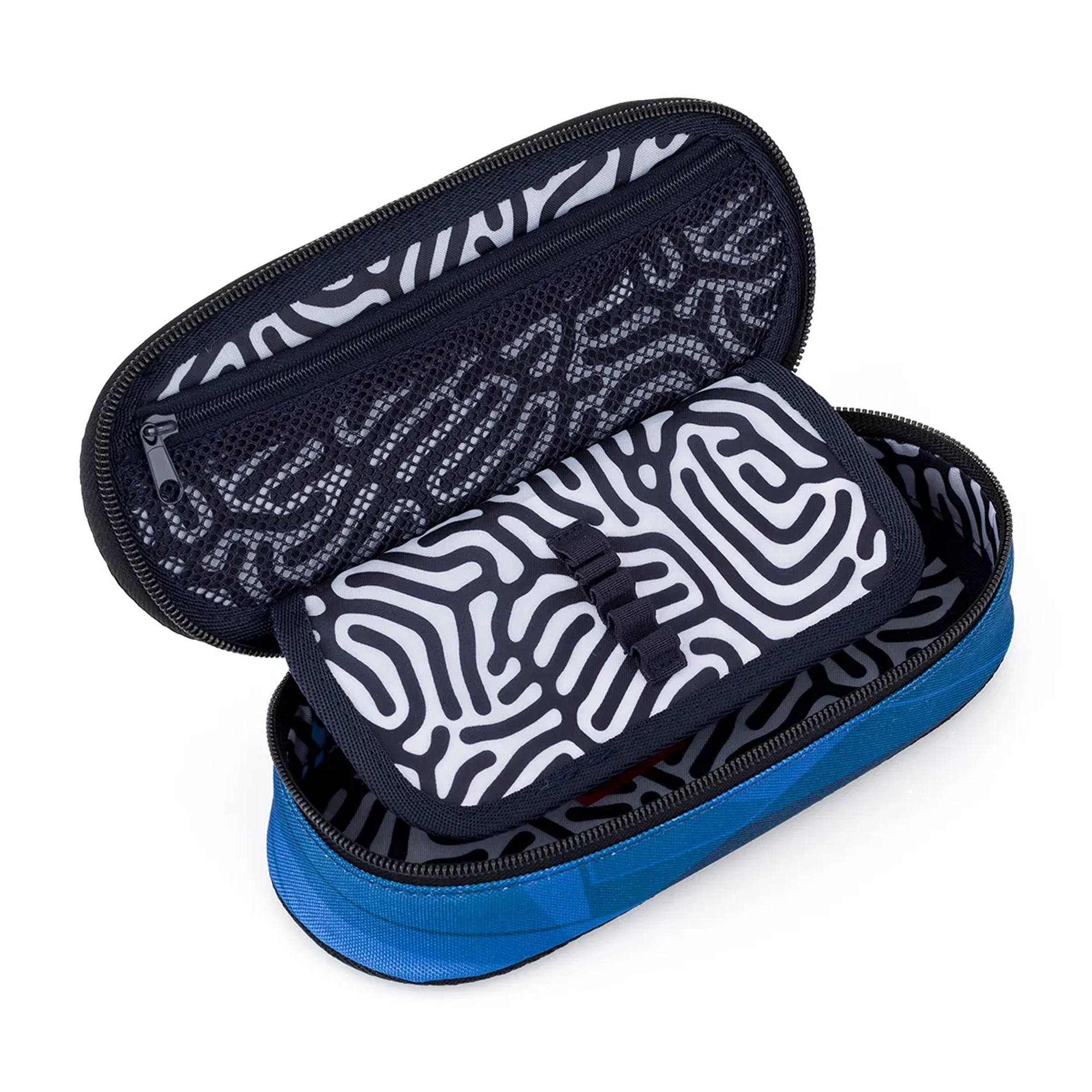 Oválny peračník je ideálnou voľbou pre starších školákov, ktorí potrebujú mať všetky písacie potreby prehľadne usporiadané na jednom mieste. Vnútorný priestor obsahuje sieťované vrecko na zips a praktickú chlopňu s gumičkami na uchytenie až deviatich písacích potrieb, ktoré chcete mať vždy poruke. Pod chlopňou sa nachádza dostatok miesta na voľné uloženie ďalších pomôcok, ako sú pastelky, fixky alebo drobnosti. Peračník je polstrovaný, spoľahlivo chráni obsah pred poškodením. Zips s veľkými uškami uľahčuje jednoduché a pohodlné otváranie aj zatváranie.