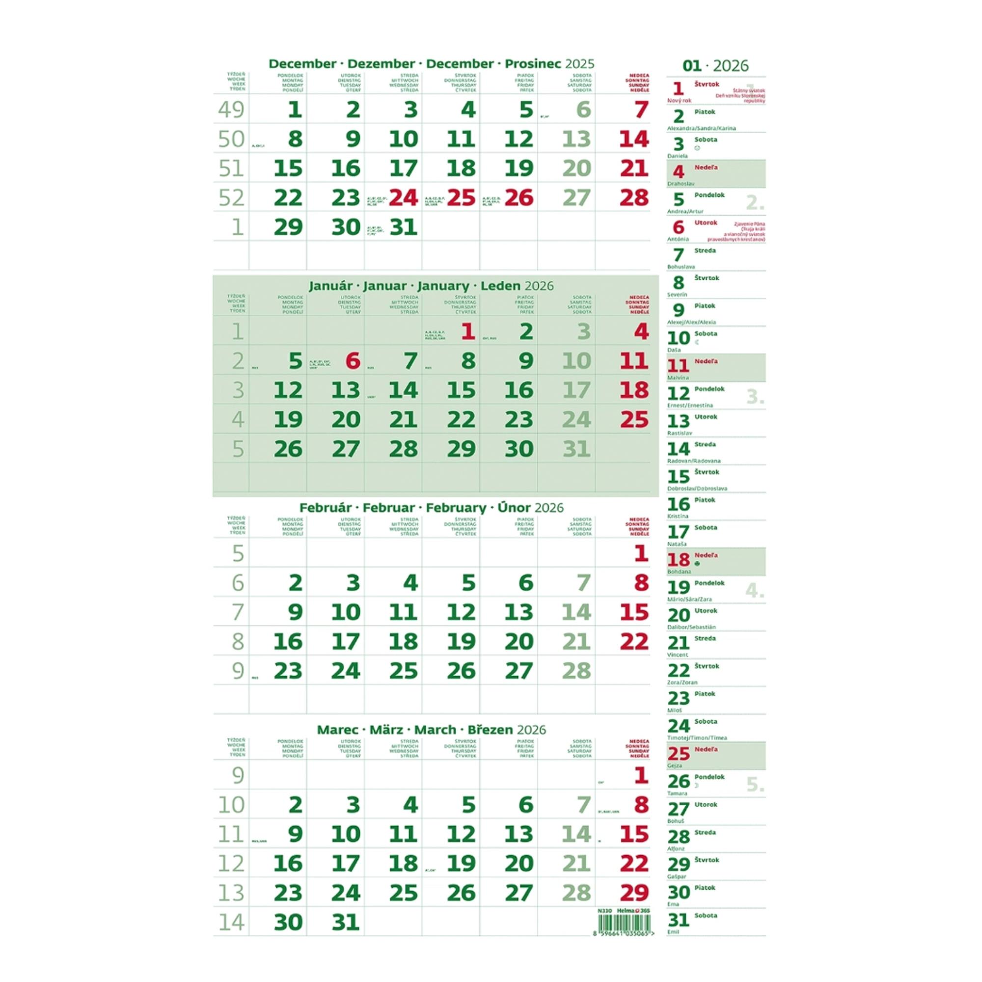 Kalendárium: slovenské trojmesačné menné so sviatkami európskych štátov (CZ / SK / A / B / D / F / H / CH / I / PL / RUS / UKR) a smiestom na poznámky Rozsah kalendára: 12 listov Priestor na potlač: 31,5 x 7 cm Formát kalendára: 31,5 x 45 cm