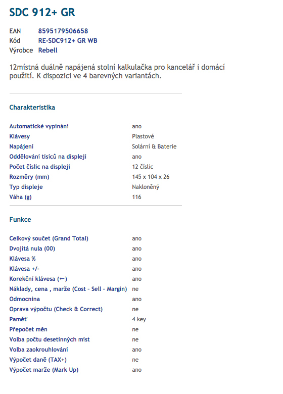 Velká stolová kalkulačka s obchodnými funkciami a prepočtom mien v atraktívnom ergonomickom prevedení. Charakteristika: Displej - 12 číslic Napájanie - solárne/bateria Oddelovanie tisícov na displeji - ano Rozmery (mm) - 193 x 143 x 38 Automatické vypínanie - ano Cost / Sell / Margin (náklady ,predajná cena, marža) - ano Klávesy +Tax / -Tax - ano Odmocnina - ano Pamäť - 1 Percentá - ano ......................... SHC200 vrecková kalkulačka so základnými funkciami v plastovom púzdre Charakteristika: Displej - 8 číslic, 1 riadok Klávesa % - ano Klávesa +/ - ano Klávesy - guma Nápájanie - solárne / batéria Oddelovanie tisícov na displeji - nie Odmocnina - ano Pamäťové klávesy - 3 Rozmery (mm) - 100 x 62 x 8 Automatické vypínanie - ano Zdroj napájania - solárny panel / LR 1131 x 1 Funkcia ,,GT" (celkový súčet) - nie Funkcia ,,MU" (počítanie položiek) - nie Funkcia pre prepočet meny - ano Klávesa ,,%" - ano Klávesa ,,+/-" - ano Klávesa ,,00" - nie Korekčné tlačidlo pre opravu poslednej zobrazovanej cifry - ano Nastavenie počtu desatinných miest - nie Odmocnina - ano Výpočet dane TAX +/- ano Zaokrúhlovanie - nie