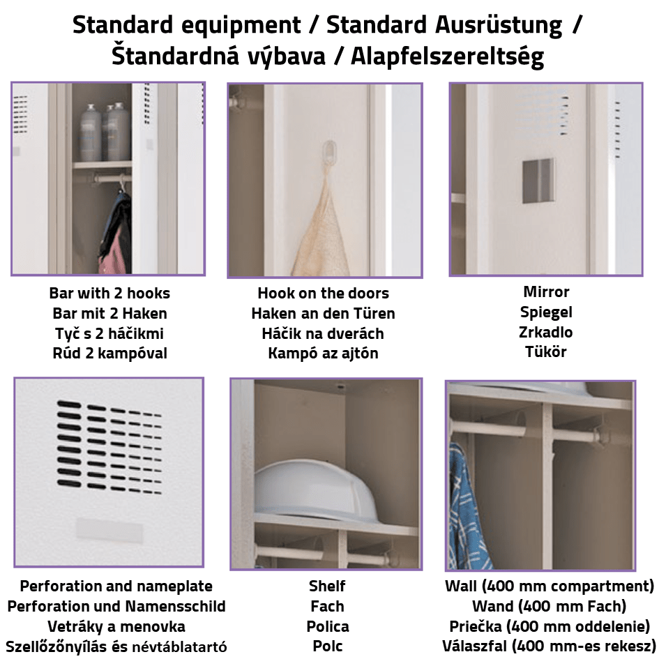Kovová šatňová skriňa. Každá bunka je vybavená jednou poličkou s tyčou na ramienka a háčikom. Na dverách s vetracími štrbinami sú umiestnené rámiky na etikety. Uzatváranie je s otočnou závorou na visiaci zámok. Povrchová úprava je realizovaná šedou práškovou farbou.