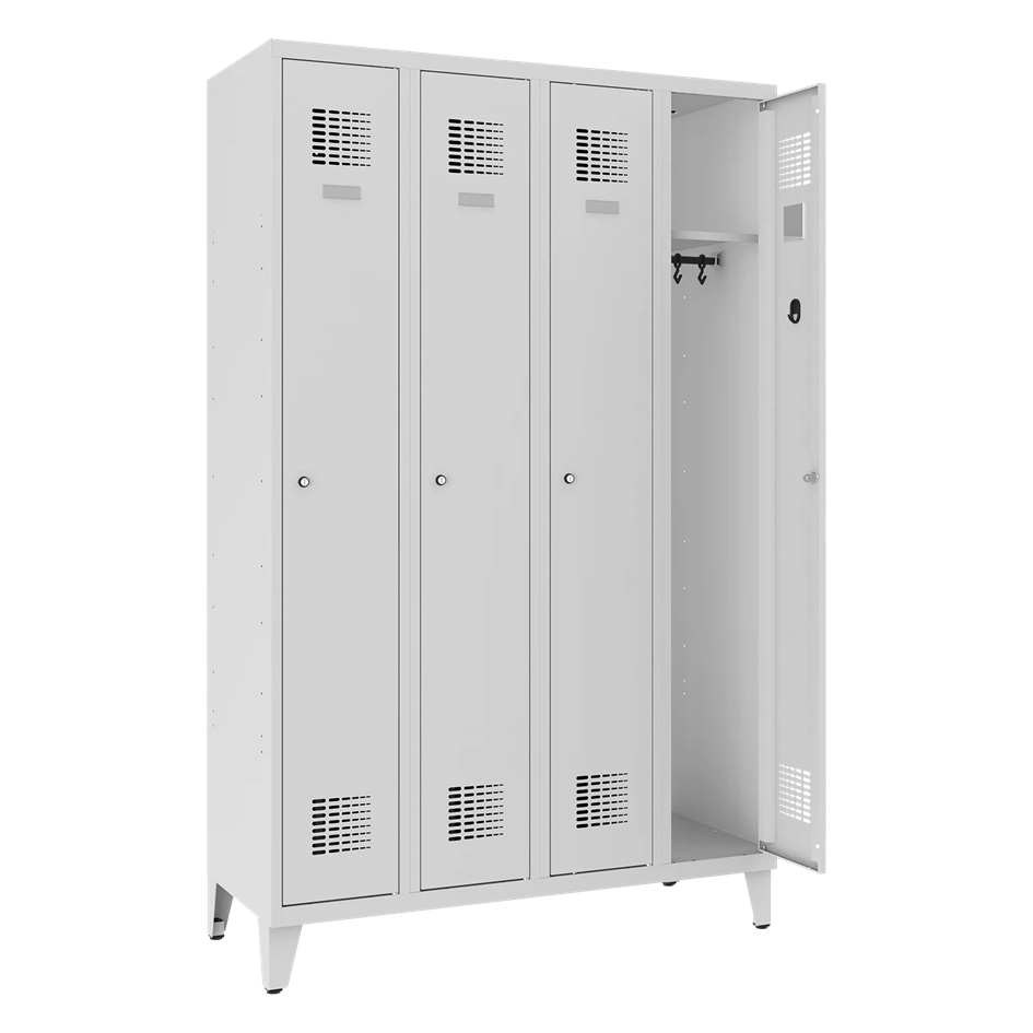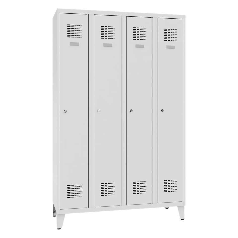 Kovová šatňová skriňa. Každá bunka je vybavená jednou poličkou s tyčou na ramienka a háčikom. Na dverách s vetracími štrbinami sú umiestnené rámiky na etikety. Uzatváranie je s otočnou závorou na visiaci zámok. Povrchová úprava je realizovaná šedou práškovou farbou. Rozmery: 194 x 120 x 49 cm Počet buniek: 4 Hmotnosť: 86 kg