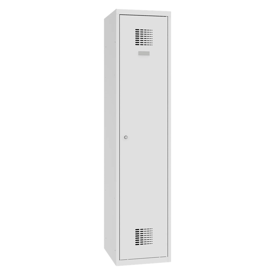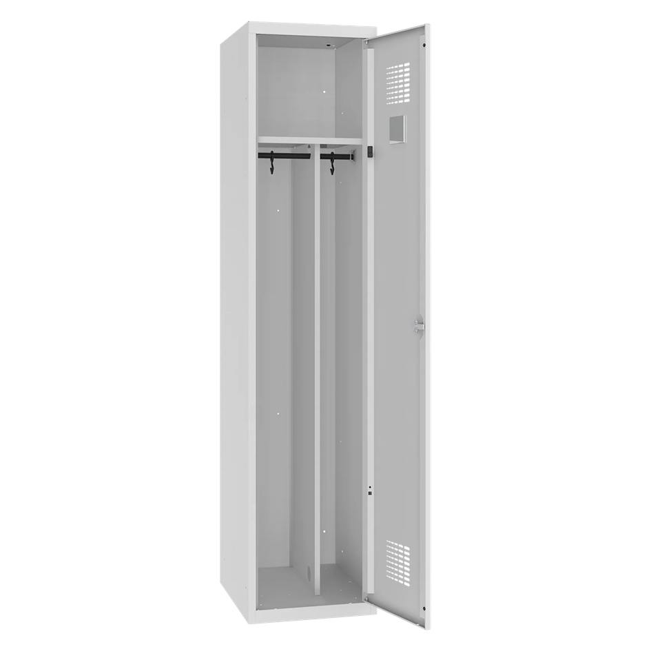 Kovová šatňová skriňa s medzistenou na rozdelenie čistého a pracovného odevu. Každá bunka je vybavená jednou poličkou s tyčou na ramienka a háčikom. Na dverách s vetracími štrbinami sú umiestnené rámiky na etikety. Uzatváranie je s otočnou závorou na visiaci zámok. Povrchová úprava je realizovaná šedou práškovou farbou.