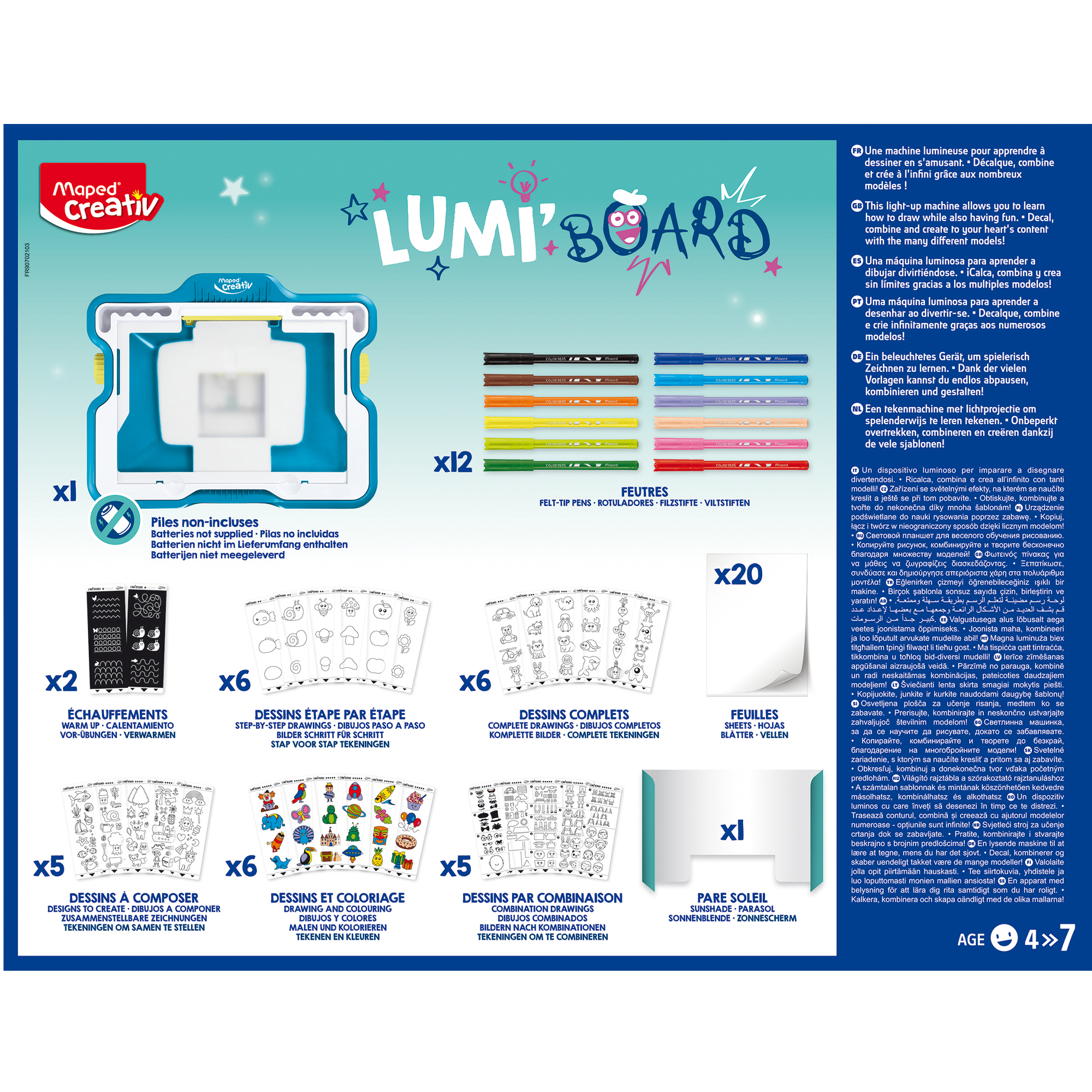 Maped Lumi Board je unikátna tabuľa, obľúbená deťmi, ktorá je určená na zábavnú a vzdelávaciu výučbu kreslenia. Táto tabuľa poskytuje možnosť prekresľovať vopred určené šablóny alebo tvoriť vlastné kompozície rôznych tvarov a postavičiek, čím podporuje rozvoj kreativity, koordinácie a jemnej motoriky u detí.