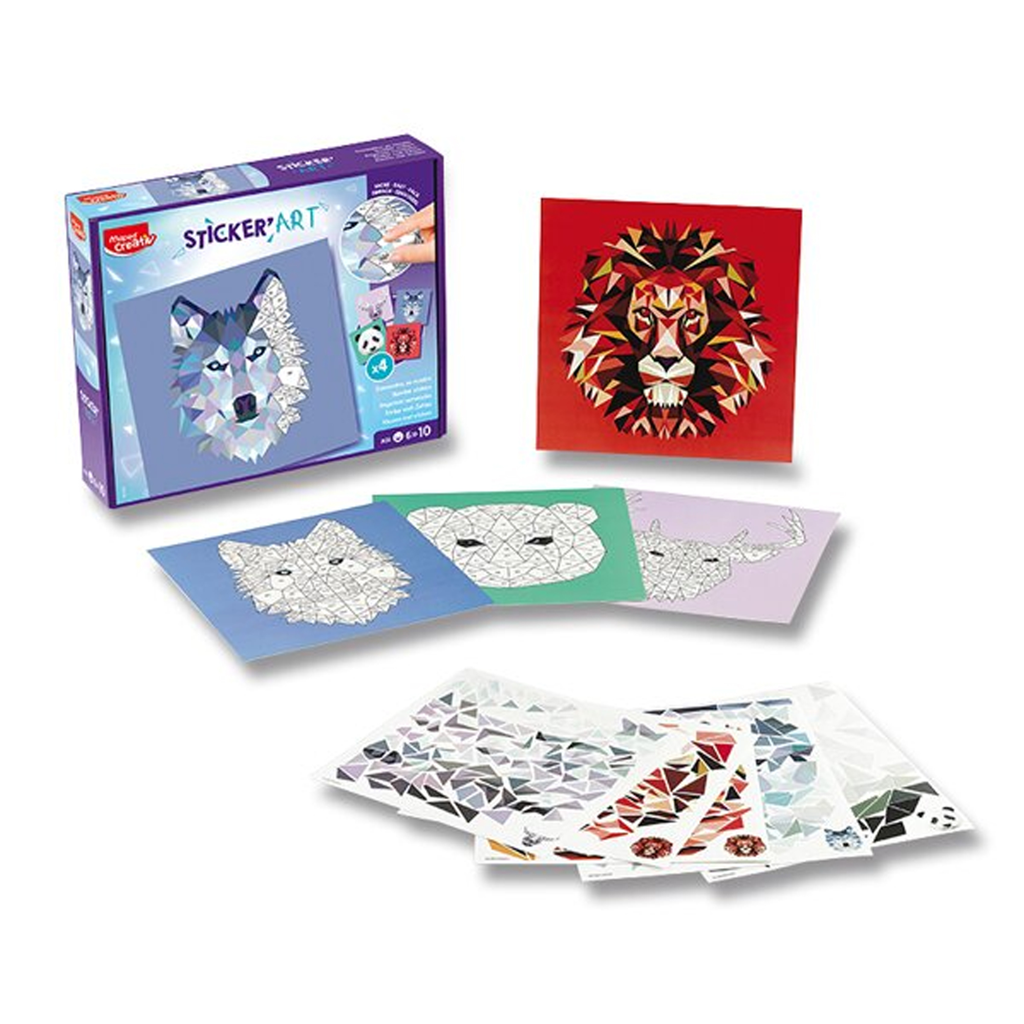 Kreatívna sada Maped Sticker' Art je navrhnutá na tvorbu nádherných originálnych portrétov zvierat pomocou techniky číslovaných nálepiek, čo zaručuje úspech i pre začiatočníkov. Sada obsahuje 4 kartónové karty o rozmeroch 20 x 20 cm pre 4 rôzne úrovne obtiažnosti, 5 hárkov samolepiacich etikiet, a 1 kartónový klin, ktorý sa môže premeniť na stojan. Vhodné pre deti od 6 rokov podľa ich zručnosti.