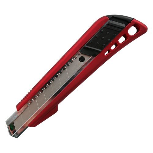 Veľký orezávací nôž s kovovým vodiacim puzdrom s nastaviteľnou vysúvacou čepeľou šírky 18 mm. Telo noža je ošetrené so špeciálnym nástrekom proti šmyku. Farba červená