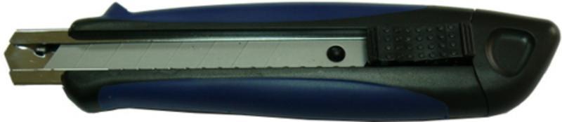 Ergonomicky tvarované pogumované odlamovaci nôž s kovovou vodiacou lištou. Nôž má zabudovaný zásobník s dvoma náhradnými čepeľami.