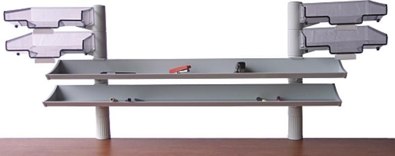 Variabilná policová zostava ku kancelárskym stolom, vďaka ktorej uložíte veci, ktoré potrebujete ku každodennej práci tak, aby Vám nezabrali miesto na pracovnom stole. Rozmery police: hĺbka 16 x dĺžka 100 cm, výška nad pracovným stolom: 15 cm, celková výška: 49 cm. 2 + 2 misky.