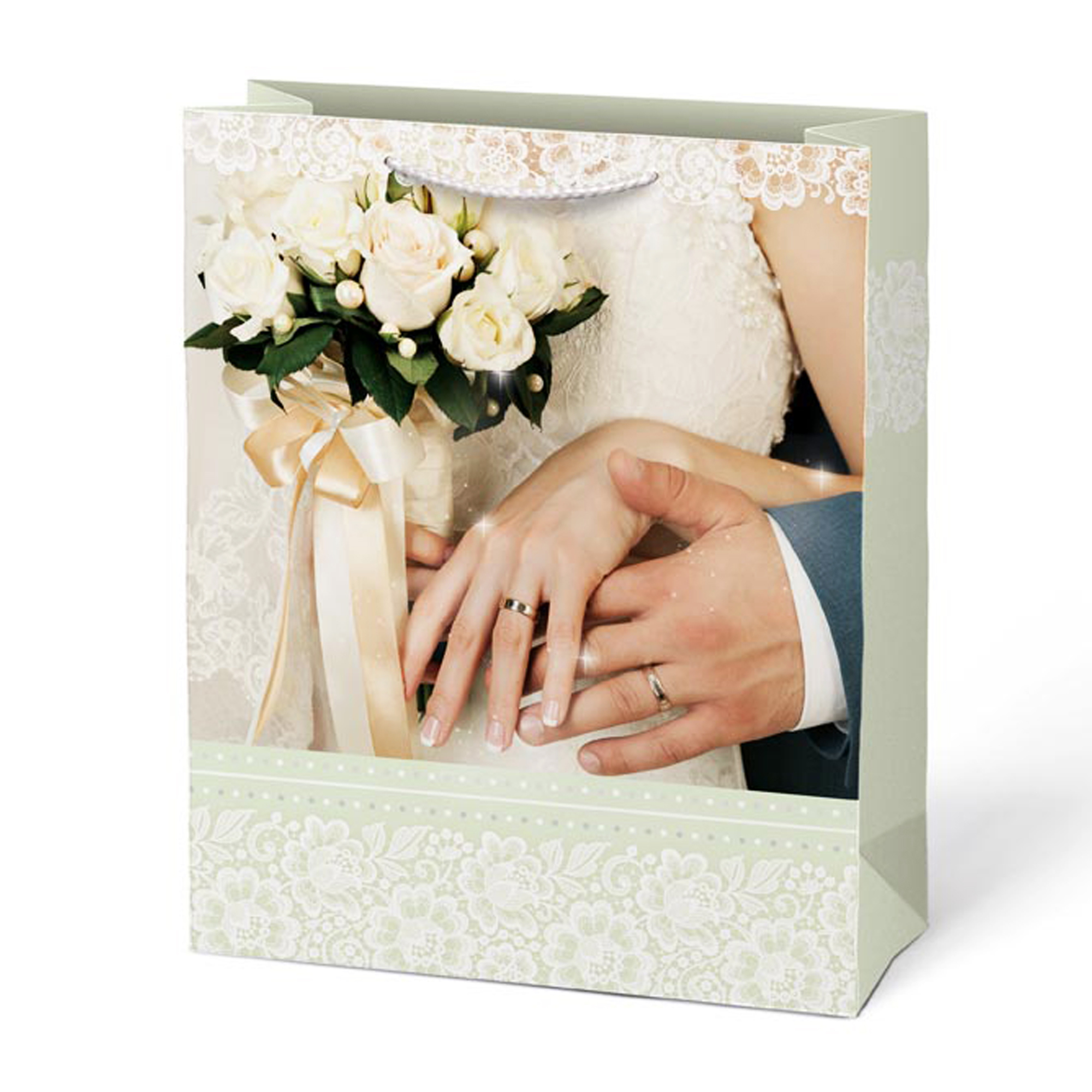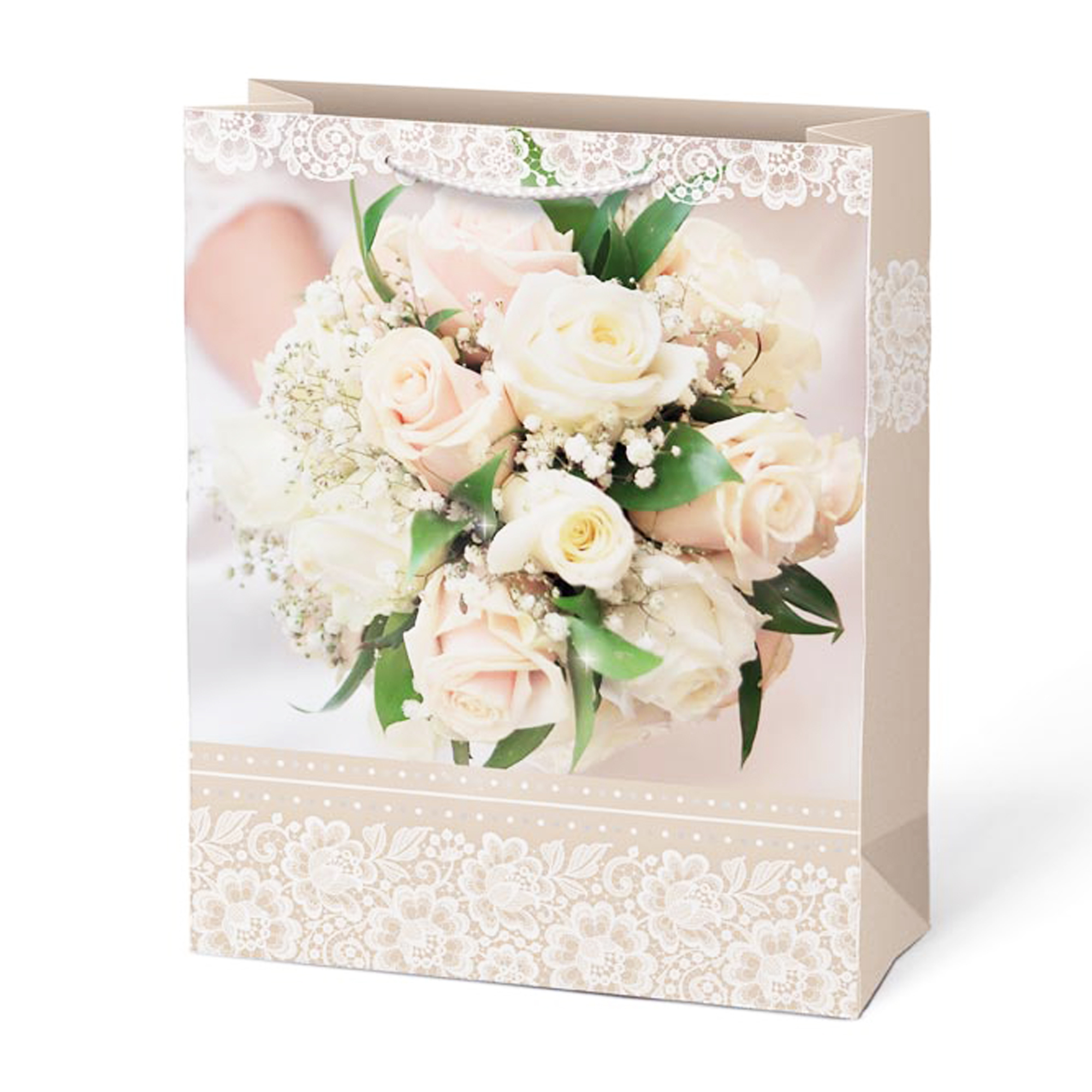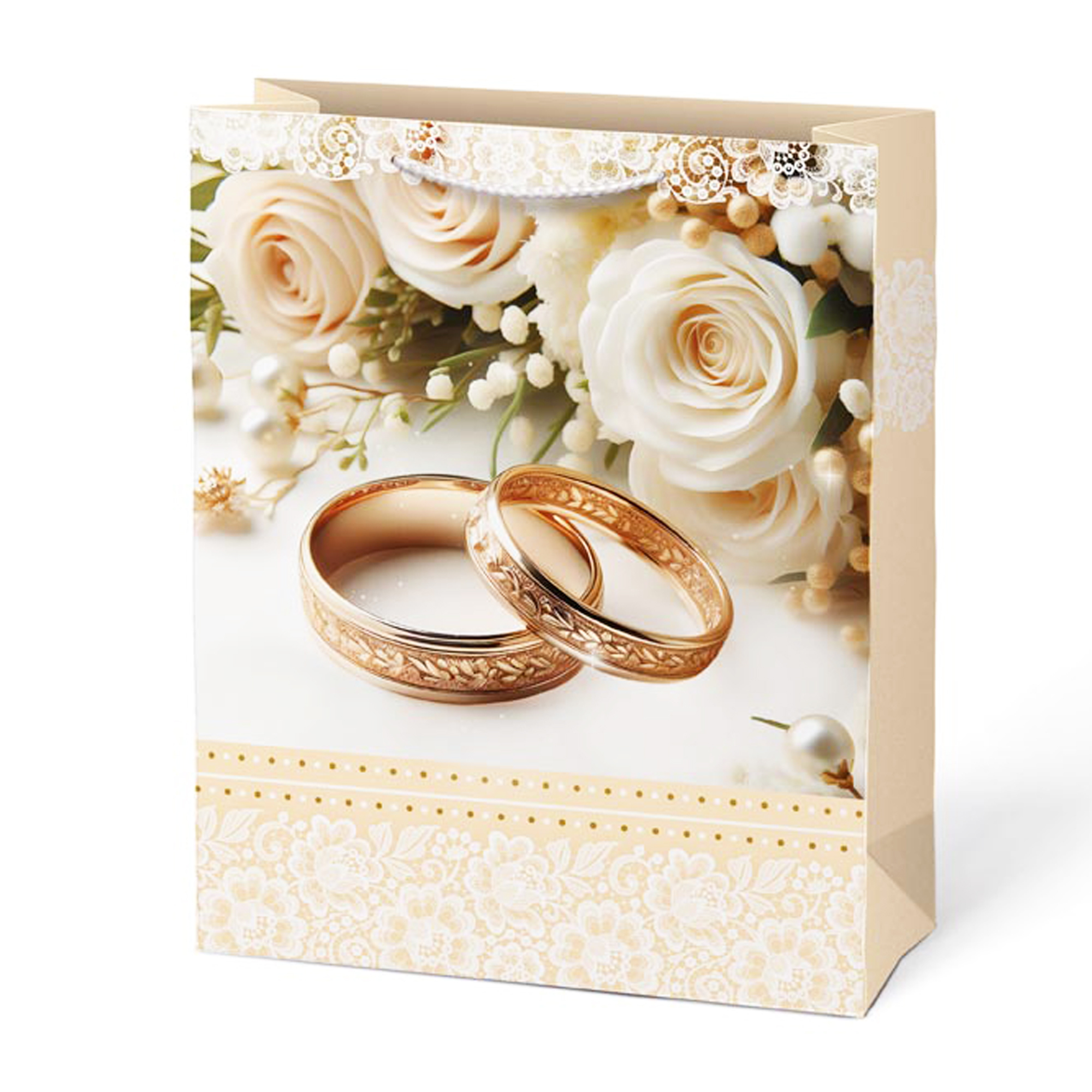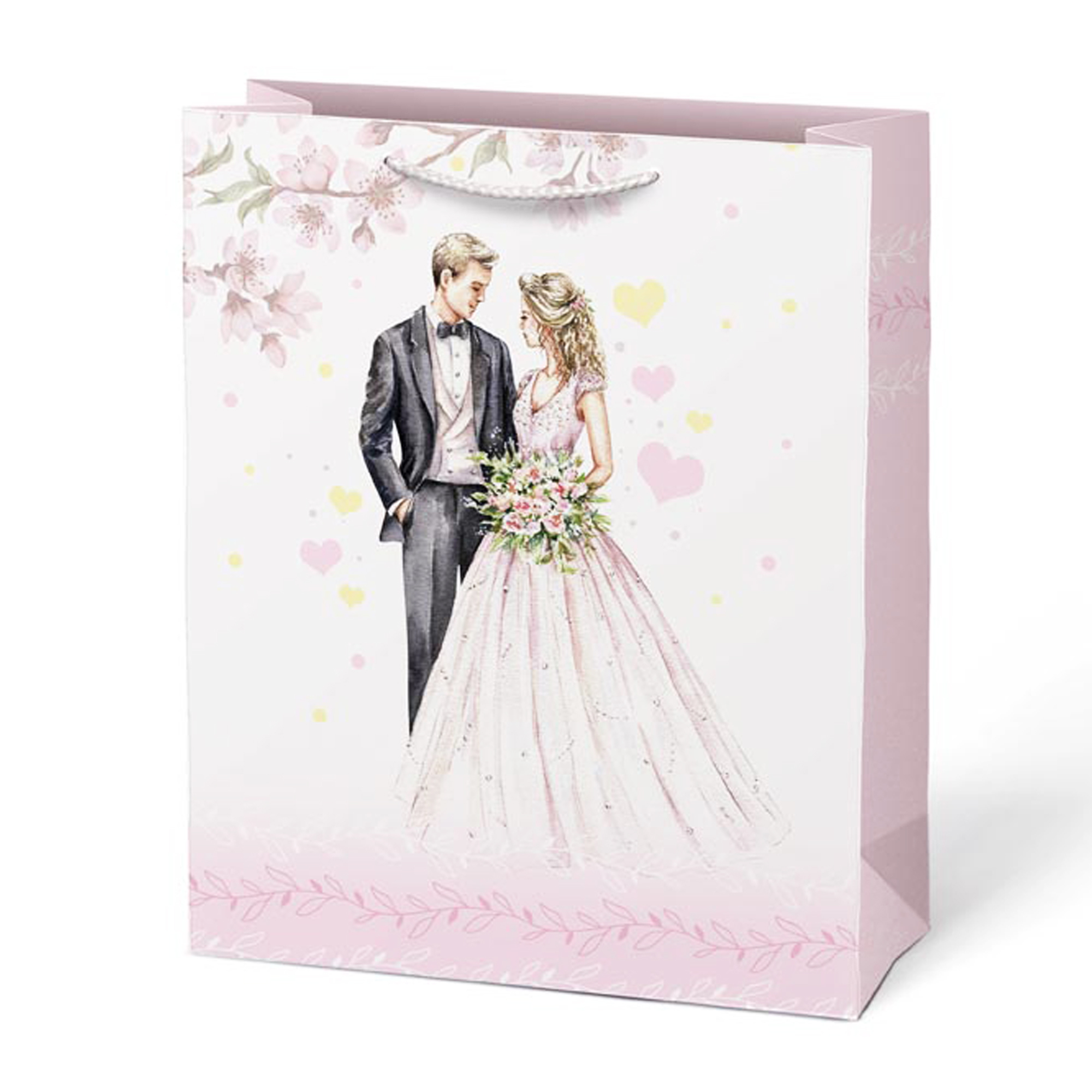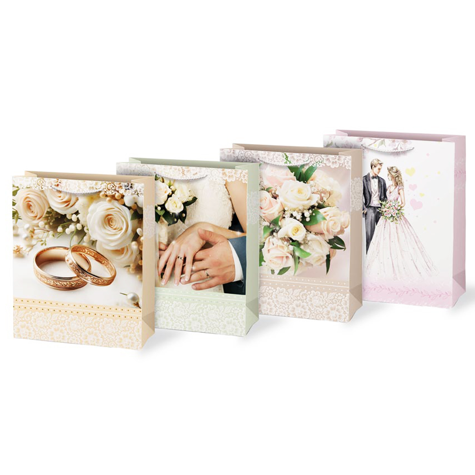 Papierová darčeková taška T4 so svadobným motívom. Predstavujeme vám našu exkluzívnu svadobnú darčekovú tašku, ktorá je určená na elegantnú a štýlovú prezentáciu vašich novomanželských darov. Výberom darčekovej tašky namiesto baliaceho papiera môžete ušetriť čas a zvýšiť estetickú hodnotu daru. Darčeková taška umožňuje rýchle a jednoduché zabalenie darčeka bez potreby zdĺhavého baliaceho papiera. Motív: svadobný Rozmery: 260 x 320 x 138 mm Dodávame v mixe 4 ks podľa skladových zásob. Uvedená cena je za 1 ks.