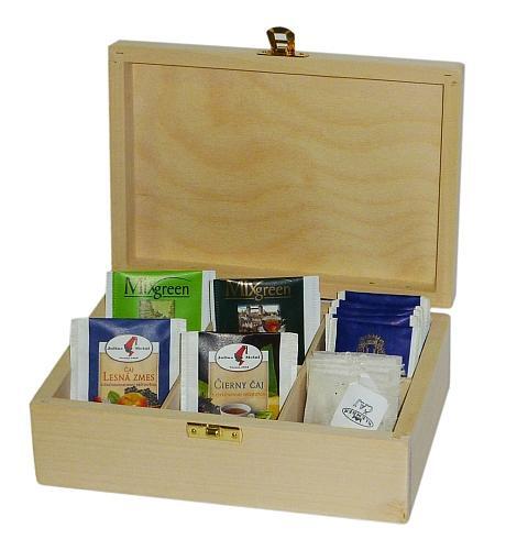 Elegantný kufrík na čaj je vyrobený z dreva bez povrchovej úpravy. Má 6 samostatných priečinkov. Zatvára sa kovovou sponou. Vnútorný rozmer priečinku je 6x6 cm. Kufrík sa predáva prázdny, vhodný na potlač alebo popisovanie.