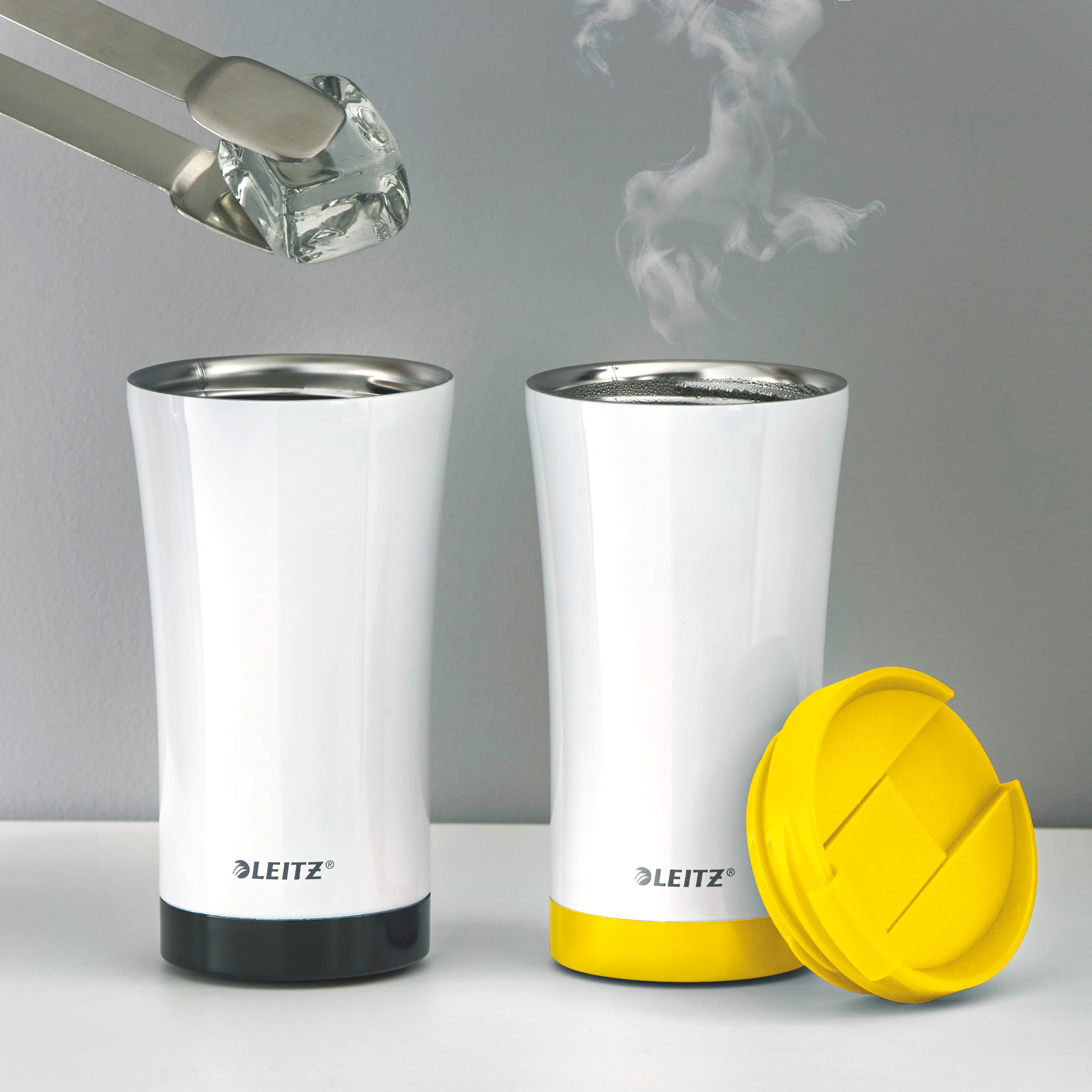 Termohrnček s obsahom 380 ml s dvojitou stenou v žiarivej žltej farbe WOW. Po celé hodiny udrží vaše nápoje teplé alebo studené. Perfektná voľba pre vychutnanie obľúbeného nápoja na cestách. Vojde sa do každého štandardného držiaka na nápoje. Tesný uzáver zaistí, že sa vám nápoj nevyleje ani pri prevrátení. Vďaka dvojitému plášťu sa dá pohodlne a bezpečne držať – nie je horúci ani orosený zvonku. Je vyrobený z antikorovej ocele s dvojitou vákuovo izolovanou stenou. Certifikované ako vhodné na styk s potravinami (food safety), plast neobsahuje BPA. Termohrnček je súčasťou radu Leitz WOW – široký sortiment výrobkov na organizáciu práce v kancelárii aj na cestách v nápadných a štýlových farbách. Rozmery 69 x 171 x 90 (mm). Váha 310g