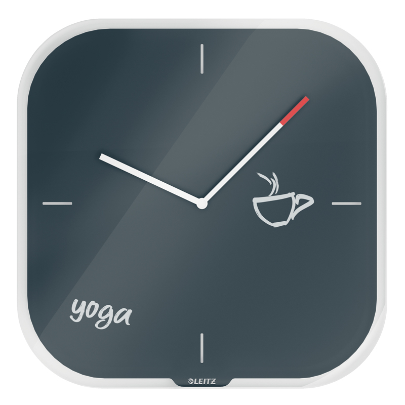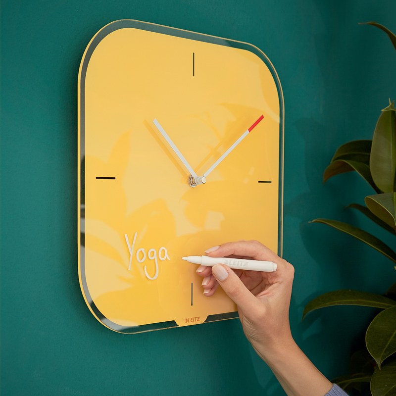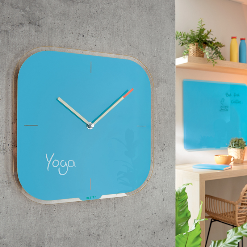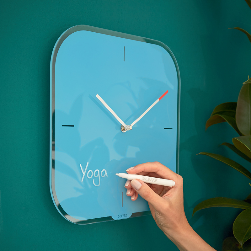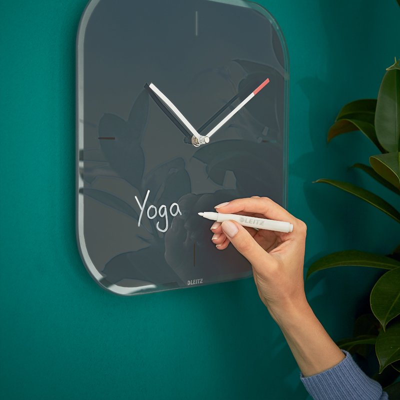 Popisovateľné tiché nástenné hodiny Leitz Cosy sú ideálne do kancelárie, študovne aj spálne, na všetky miesta, kde nechcete byť rušení tikaním hodín. Minimalistické značenie na ciferníku dáva priestor na zapísanie napr. pripomienok, času vlastných schôdzok pomocou priloženého popisovača. Tieto moderné kvalitné hodiny sú perfektným doplnkom vášho domova alebo kancelárie, nebudú vás rušiť a zároveň môžete byť vždy a všade včas. Tichý quartz mechanizmus neruší tikaním. Obsahuje stierateľný popisovač na písanie poznámok. Vyrobené z tvrdeného bezpečnostného skla s hrúbkou 4 mm, s vysokou stierateľnosťou a odolnosťou proti poškriabaniu a preliačinám. Minútová ručička s výrazným červeným zakončením na farebné osvieženie. Vyžaduje 1× AA batériu (nie je súčasťou balenia). Kolekcia Leitz Cosy kombinuje komfort domáceho pohodlia s prvotriednou kvalitou a vytvára tak pozitívne a produktívne pracovné prostredie. Perfektne ladia so sklenenou tabuľou Leitz Cosy.