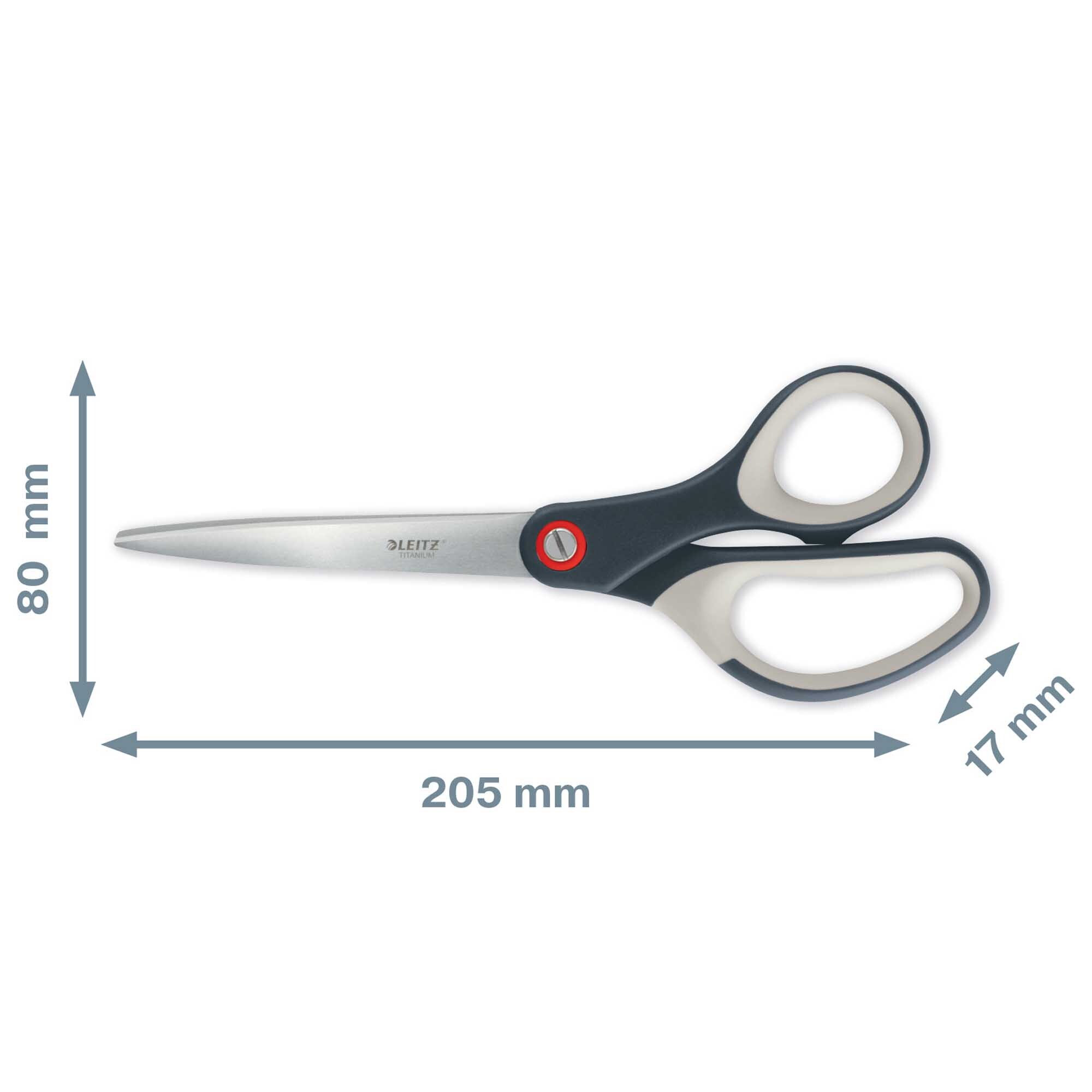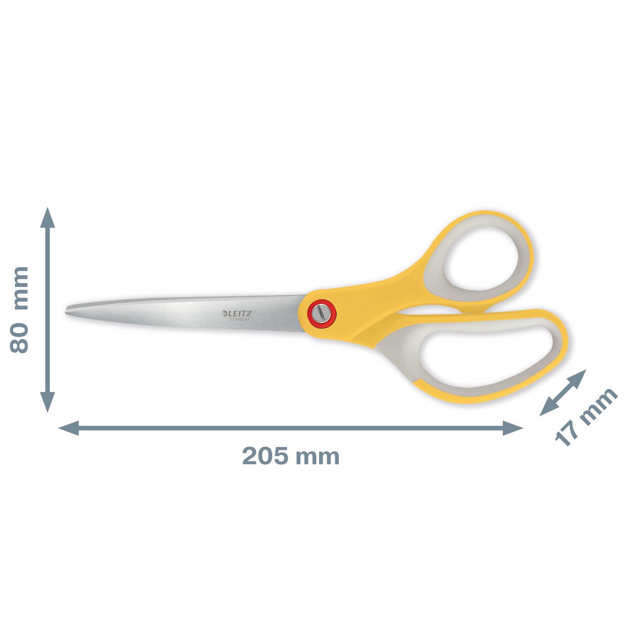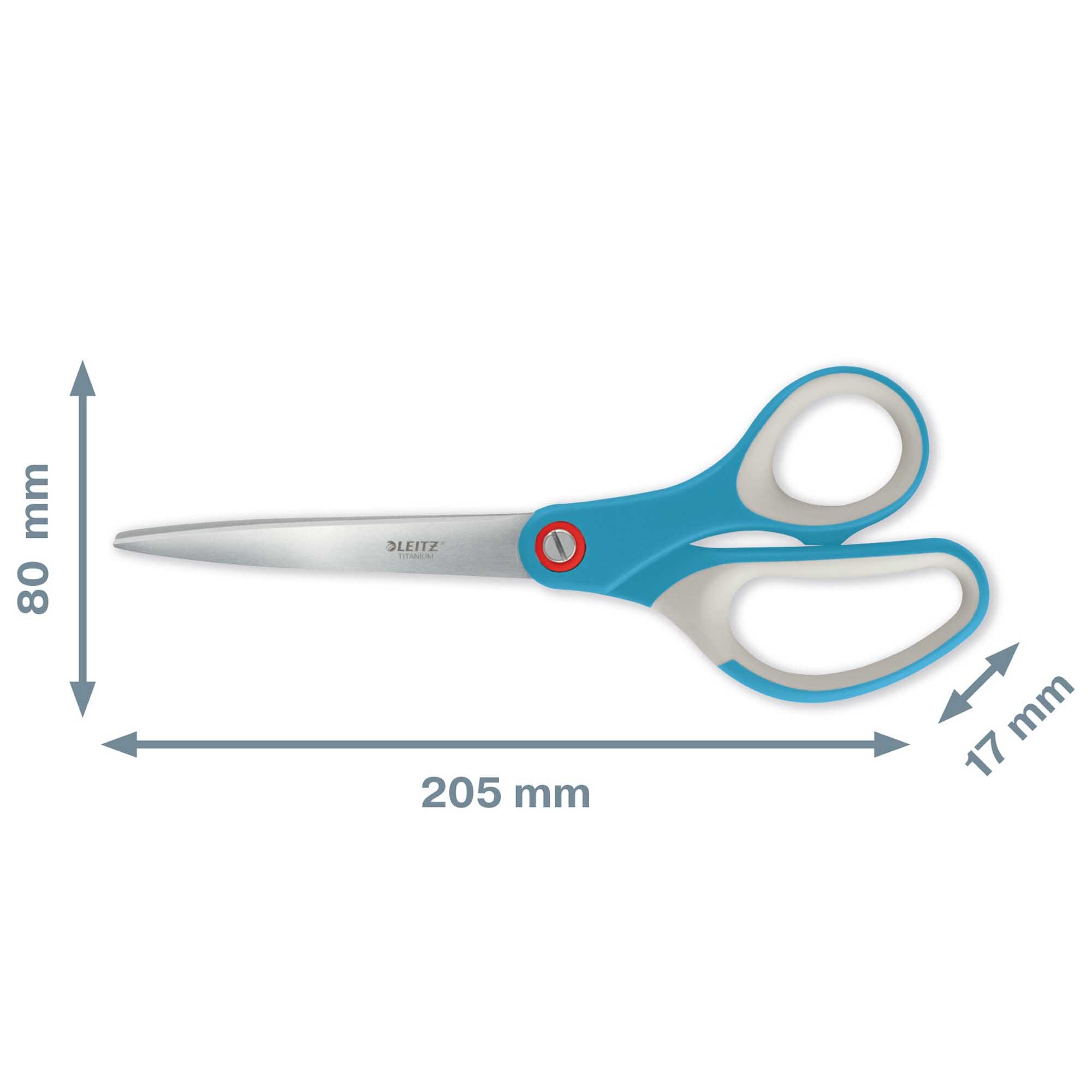 Titánové kancelárske nožnice Leitz Cosy sú vyrobené z nemeckej nehrdzavejúcej ocele potiahnuté titánom. Ergonomická rukoväť na pohodlnú manipuláciu a titánové čepele dĺžky 205 mm zaručujú presné strihanie a sú určené na všetky typy strihania. Odolné titánové nože zostávajú ostré oveľa dlhšie ako bežné nože. Kolekcia Leitz Cosy kombinuje komfort domáceho pohodlia s prvotriednou kvalitou a vytvára tak pozitívne a produktívne pracovné prostredie. Záruka 10 rokov.