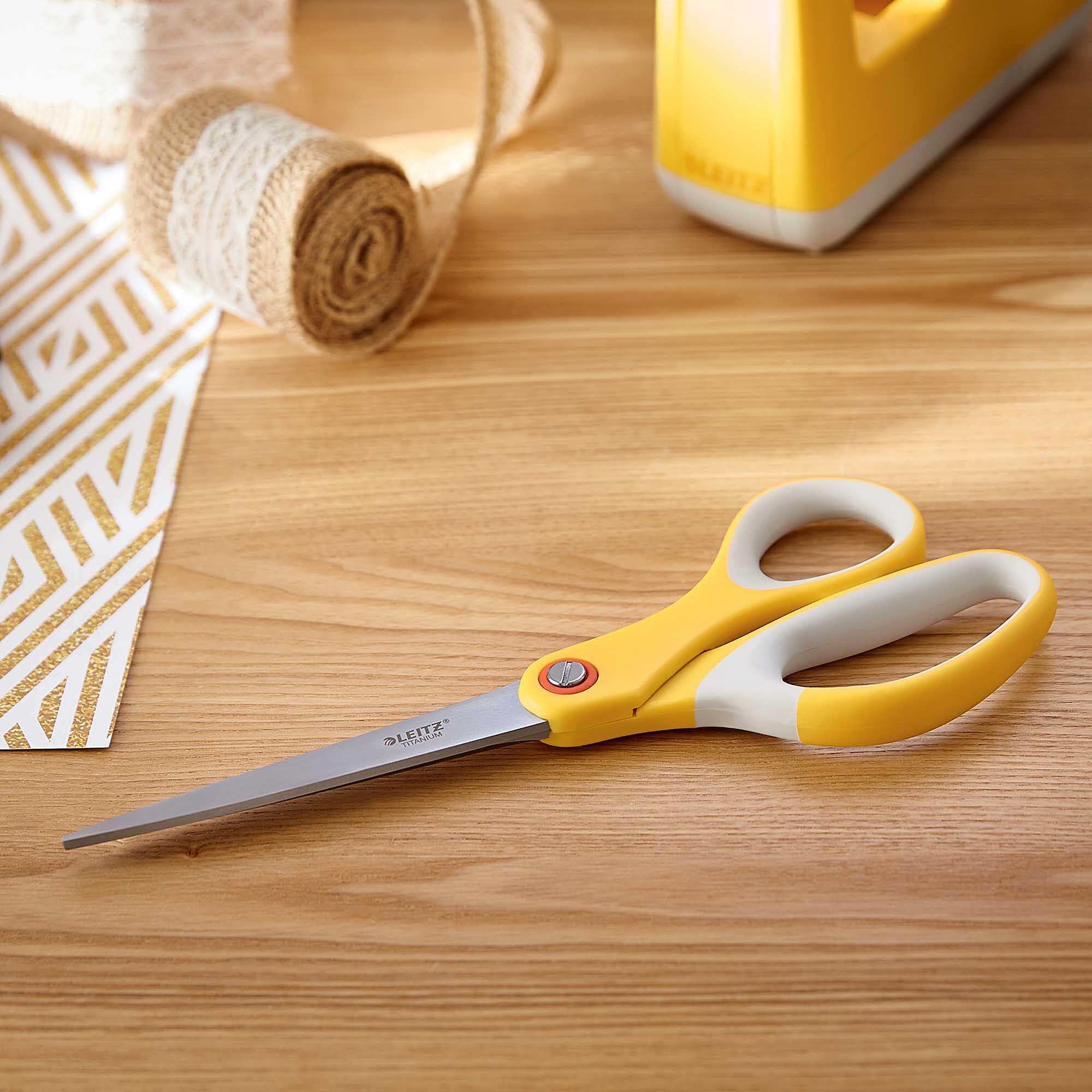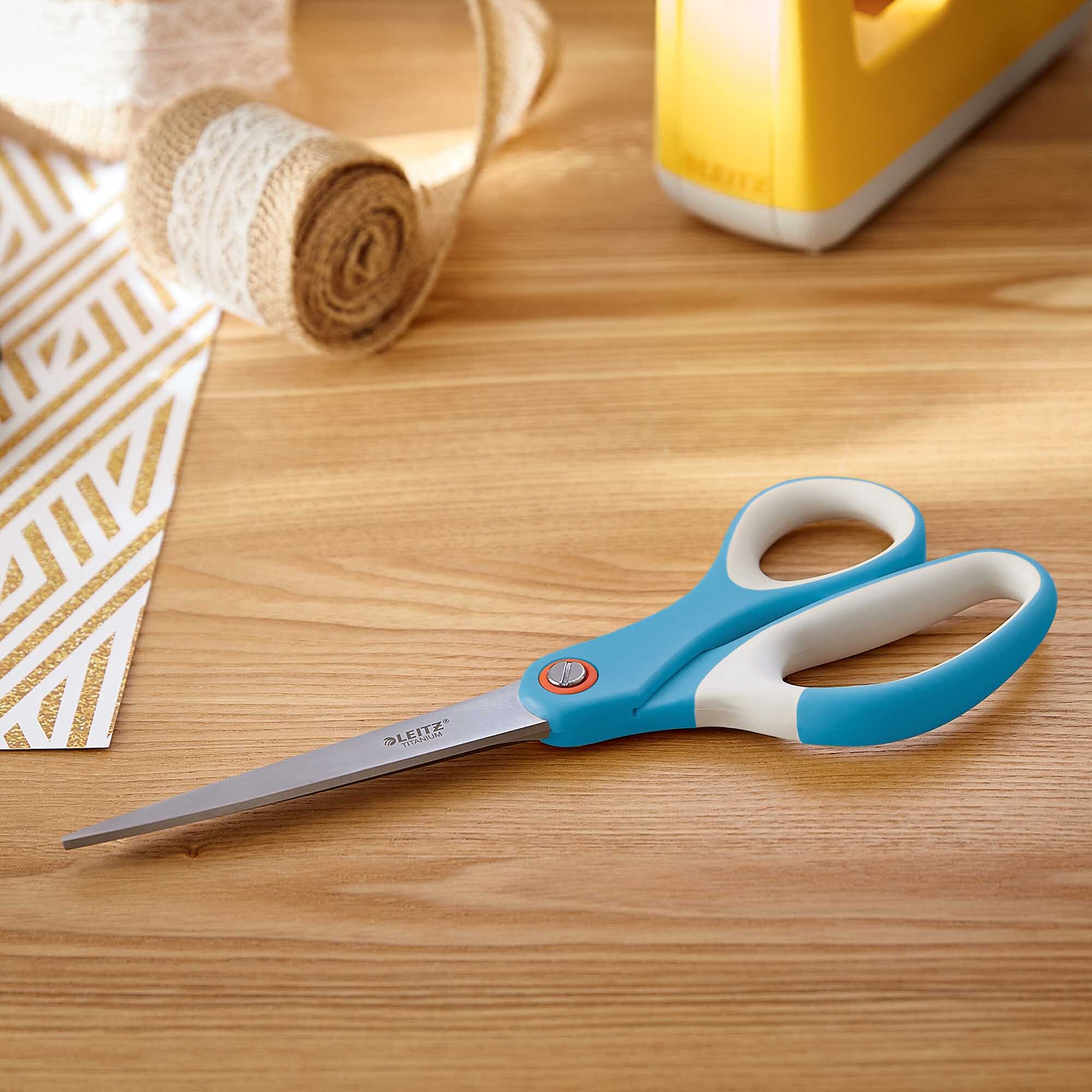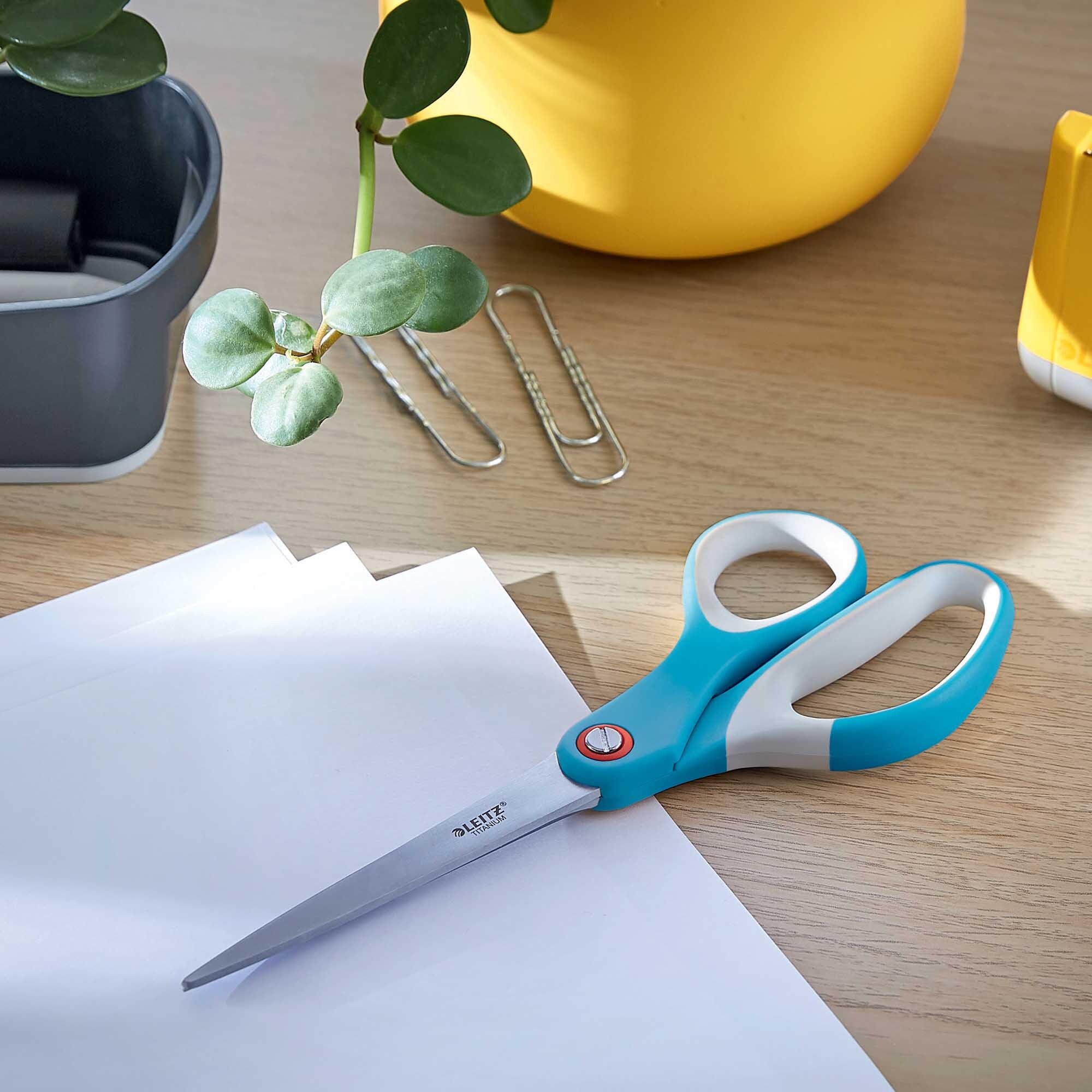 Titánové kancelárske nožnice Leitz Cosy sú vyrobené z nemeckej nehrdzavejúcej ocele potiahnuté titánom. Ergonomická rukoväť na pohodlnú manipuláciu a titánové čepele dĺžky 205 mm zaručujú presné strihanie a sú určené na všetky typy strihania. Odolné titánové nože zostávajú ostré oveľa dlhšie ako bežné nože. Kolekcia Leitz Cosy kombinuje komfort domáceho pohodlia s prvotriednou kvalitou a vytvára tak pozitívne a produktívne pracovné prostredie. Záruka 10 rokov.