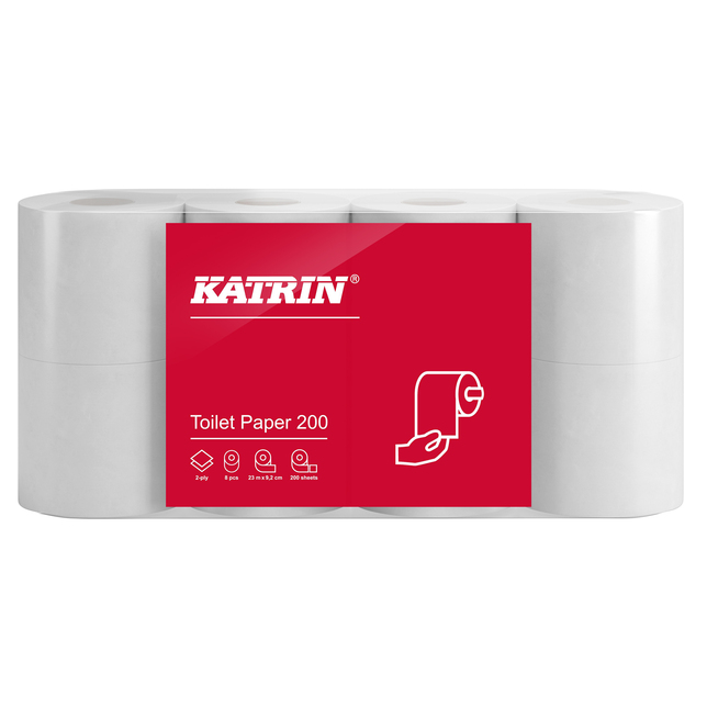 Vyrobené zo 100% celulózy. Návin kotúča 23bm, 200 útržkov. Rozmer útržku: 11,5 x 9,2 cm. Balenie 8 kot. Všetky toaletné papiere Katrin sú vyrobené z vysoko kvalitných vlákien a bolo dokázané, že sa testom Rozpúšťanie 90 sekúnd, metódou Metsä Tissue 02, za normálnych podmienok použitia rýchlo a efektívne rozpadajú a rozpúšťajú vo vode. - Priemer dutinky 44mm