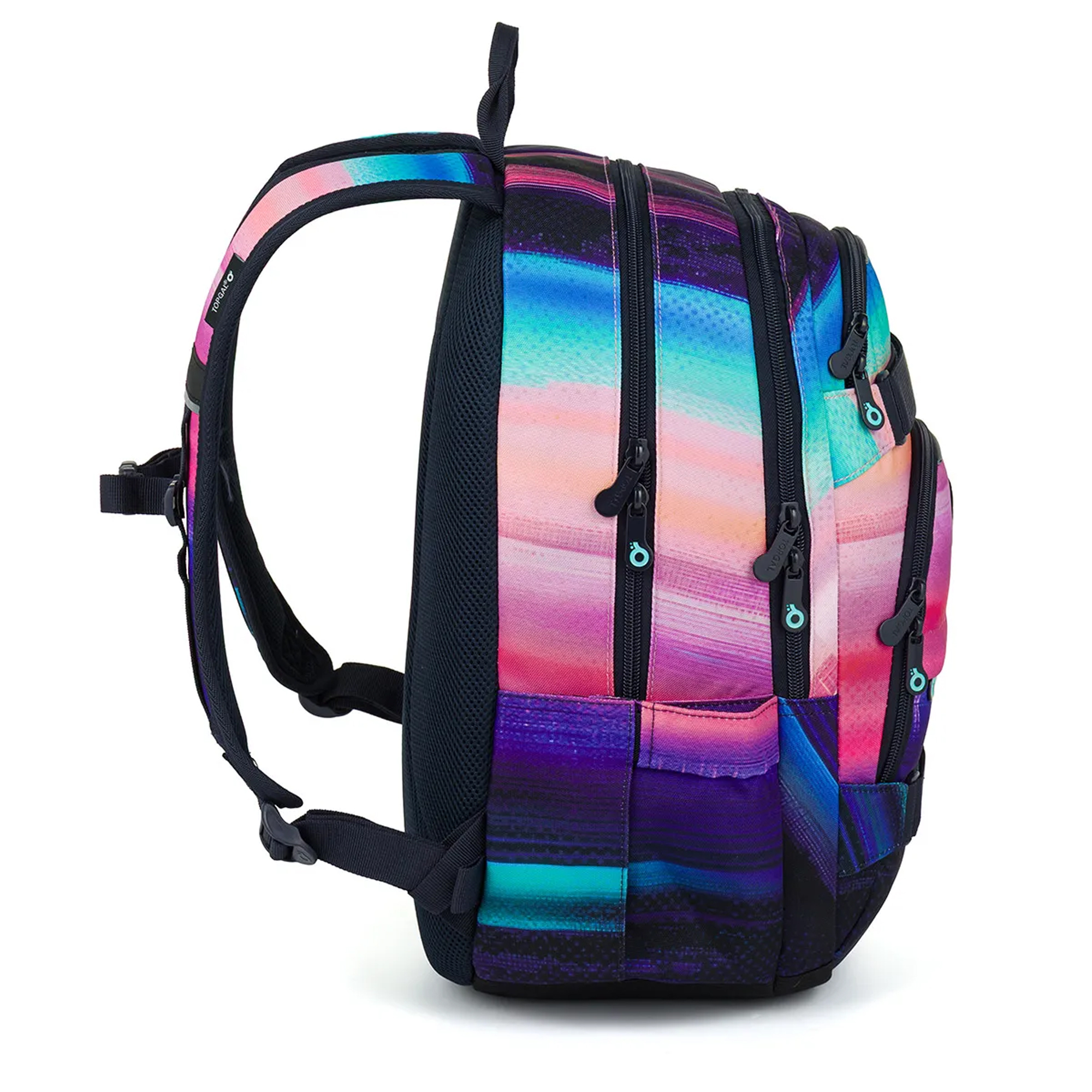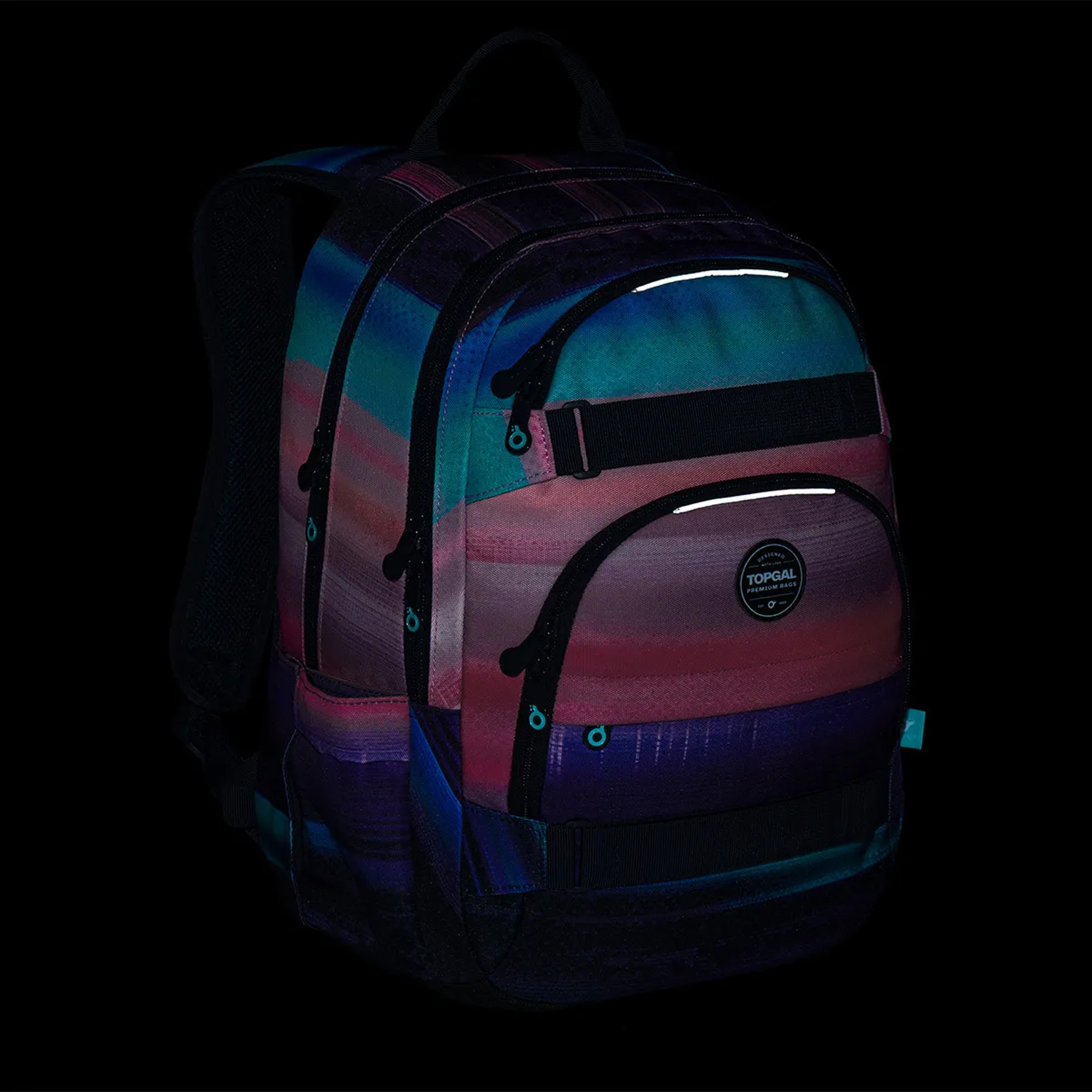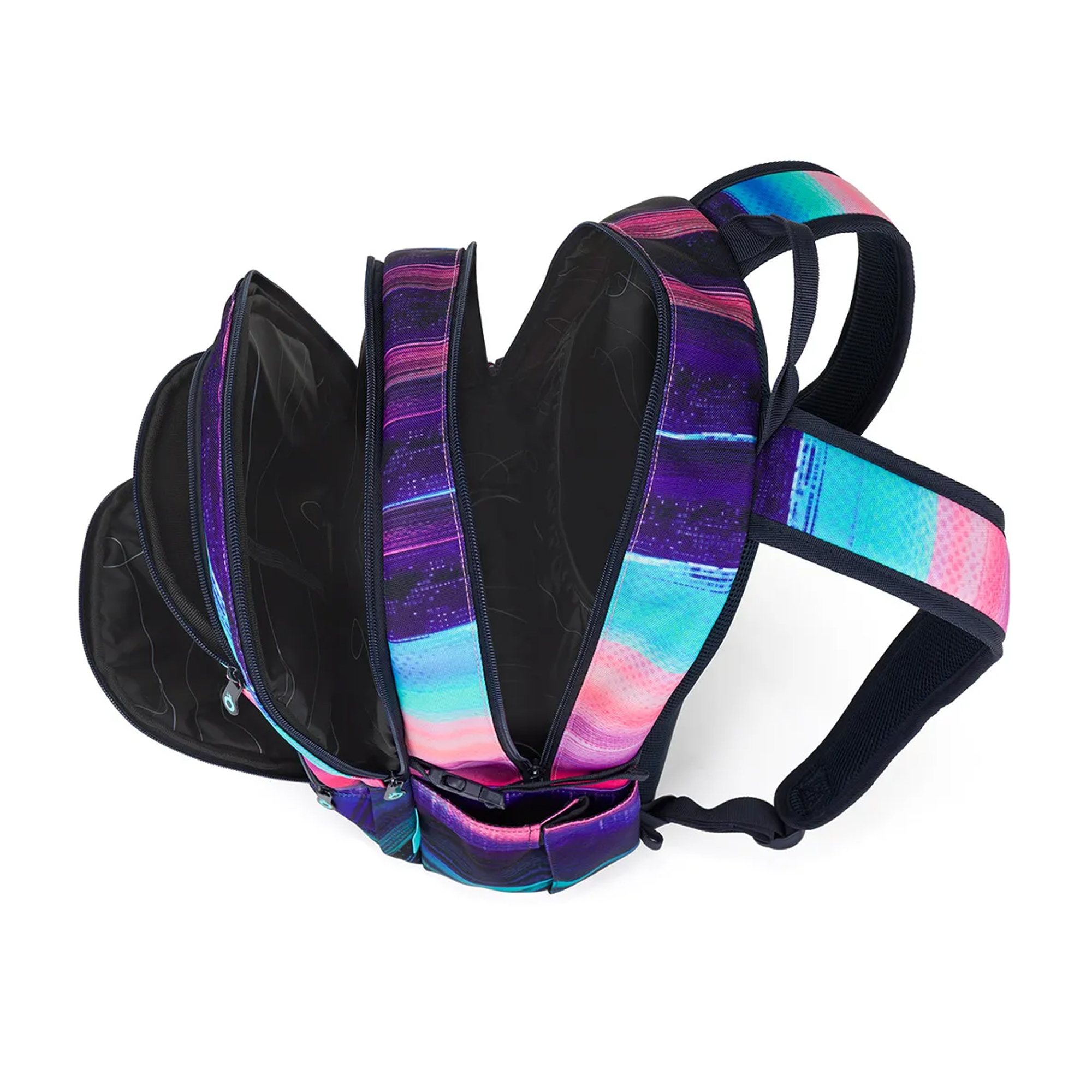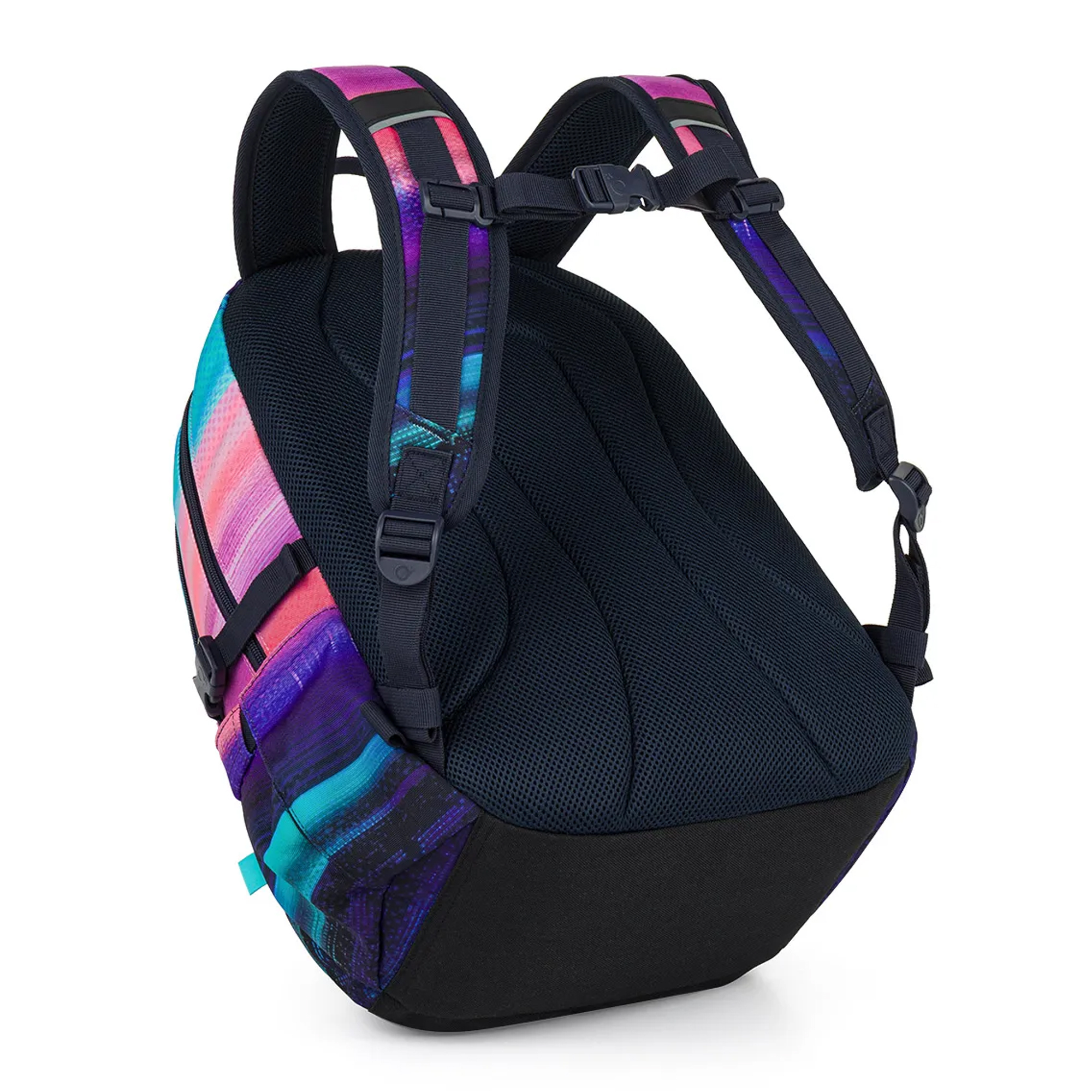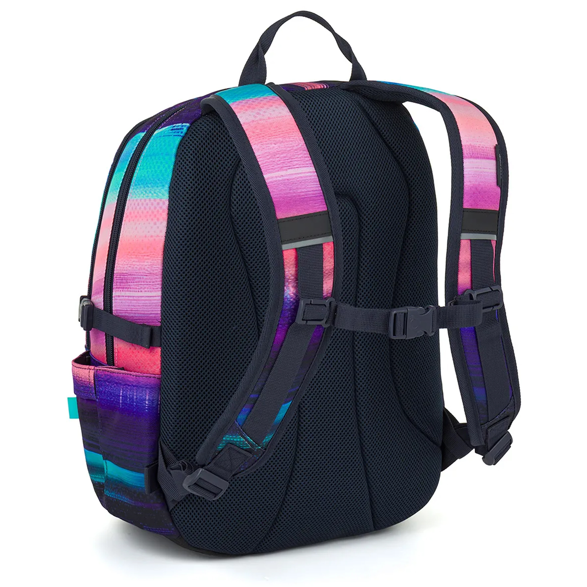 Kétkamrás hátizsák modern, vízszintes csíkos mintával, türkiz, rózsaszín és lila árnyalatokban. A hátizsák háta párnázott és anatómiailag formázott puha habból készült. A hátsó rekeszben párnázott zseb található laptop és tablet számára.