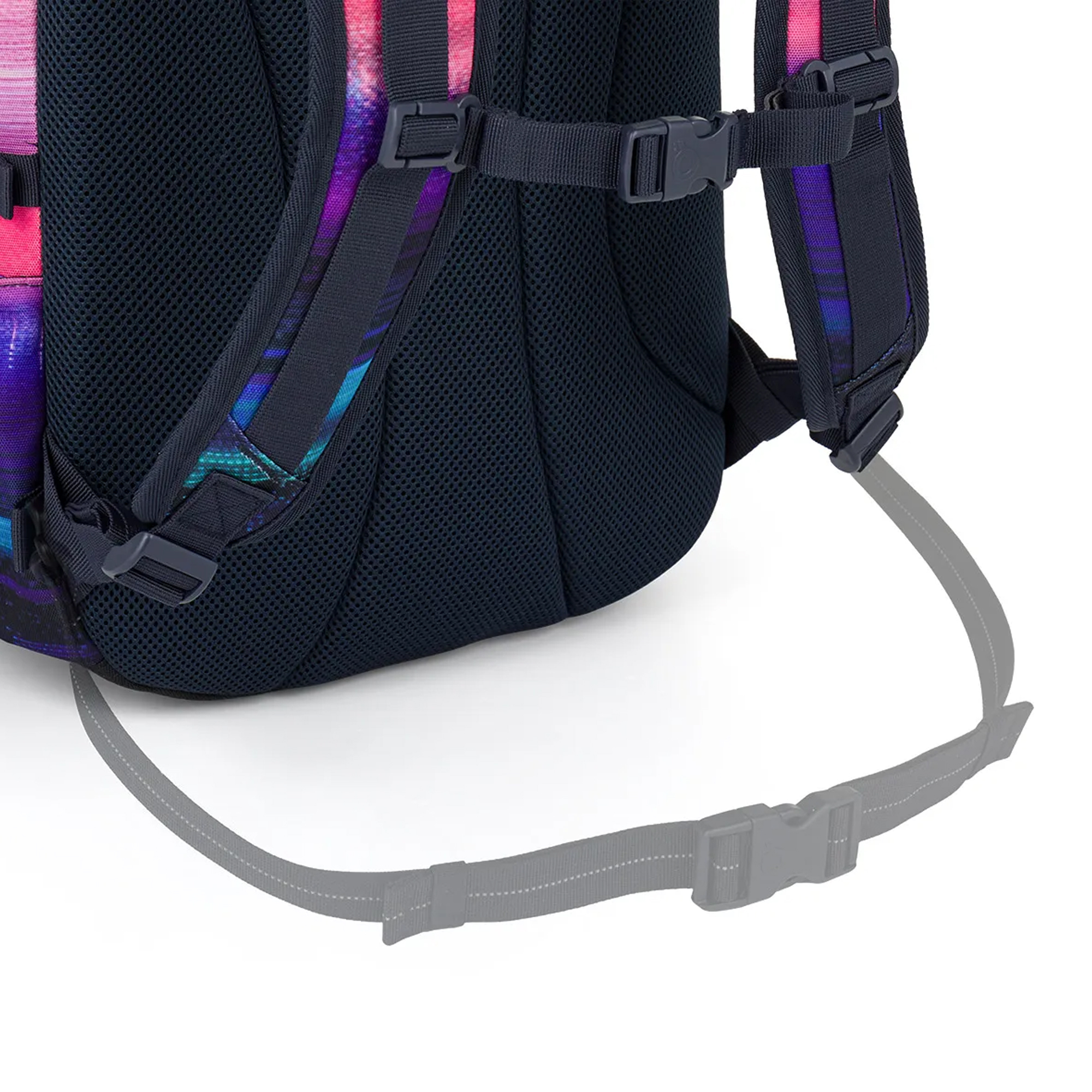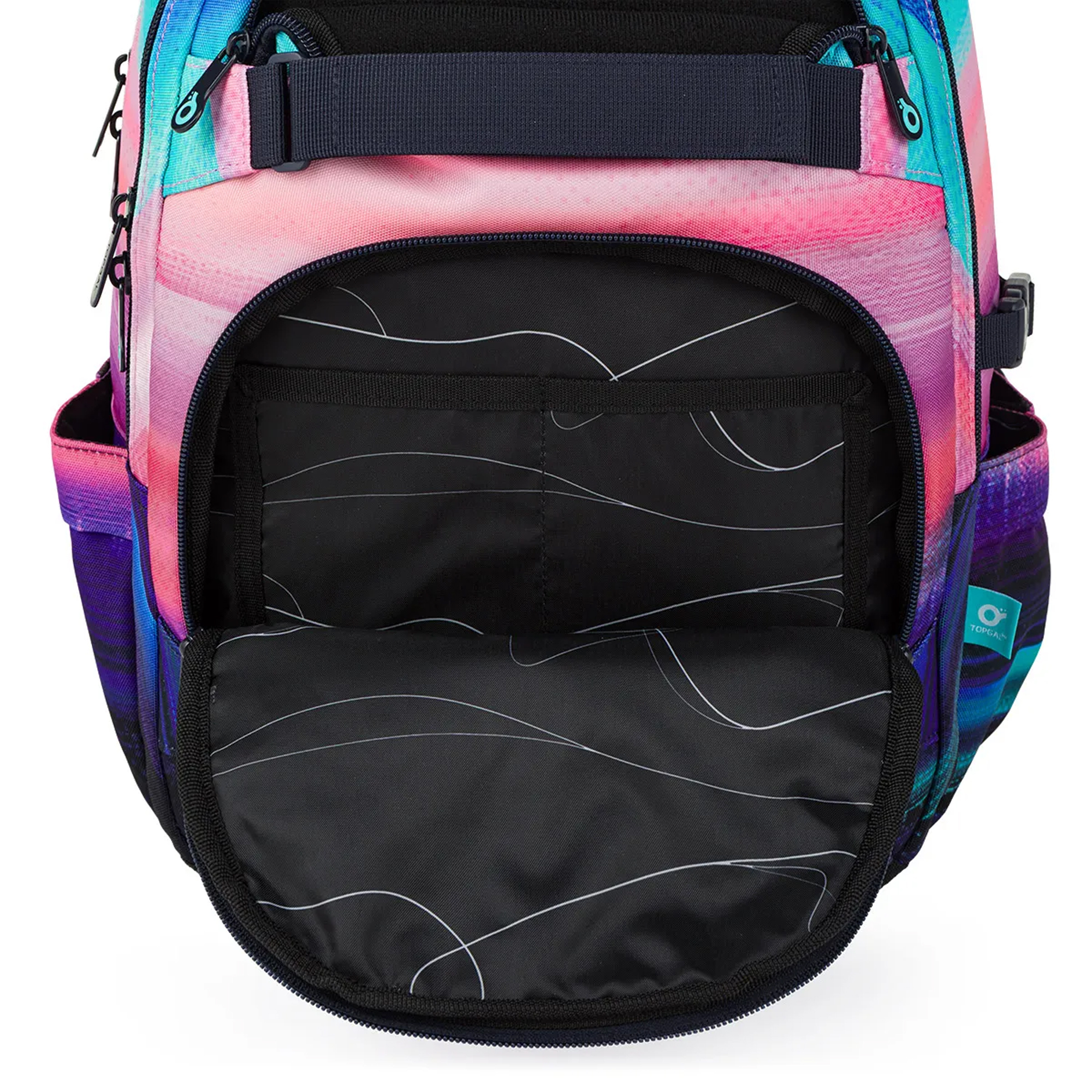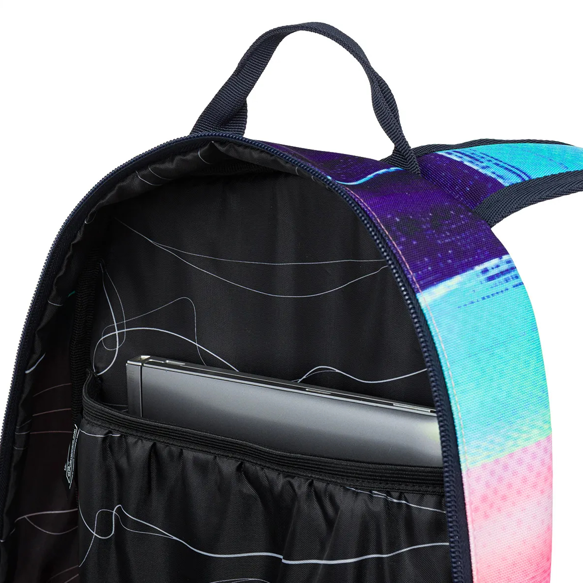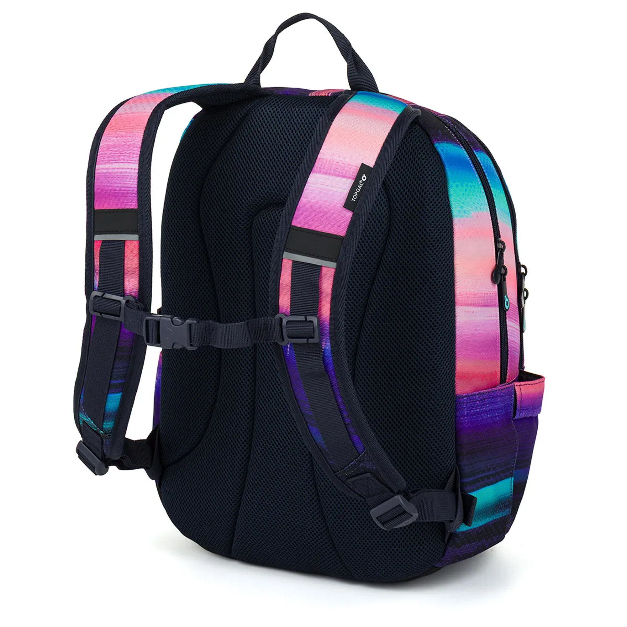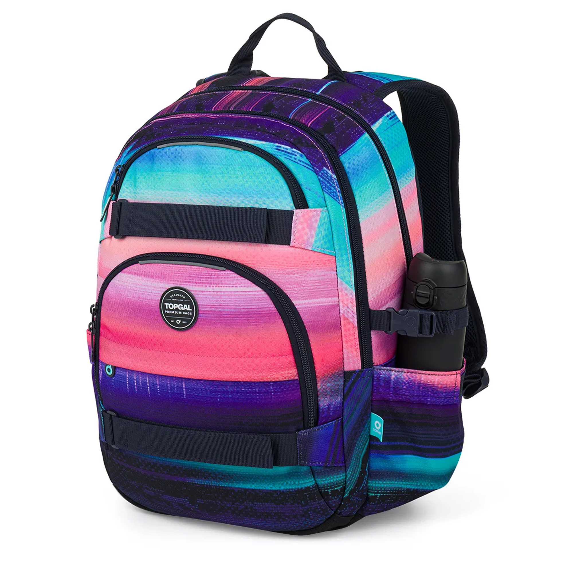 Kétkamrás hátizsák modern, vízszintes csíkos mintával, türkiz, rózsaszín és lila árnyalatokban. A hátizsák háta párnázott és anatómiailag formázott puha habból készült. A hátsó rekeszben párnázott zseb található laptop és tablet számára.