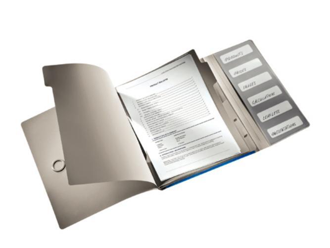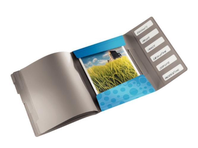 Na štýlovú organizáciu dokumentov. S atraktívnym kovovým uzáverom na bezpečné uschovanie obsahu S 3 chlopňami vzadu na ukladanie netriedených strán S vreckom na CD Formát A4 12 deliacich strán, odnímateľný register obsahu Farba Modrá