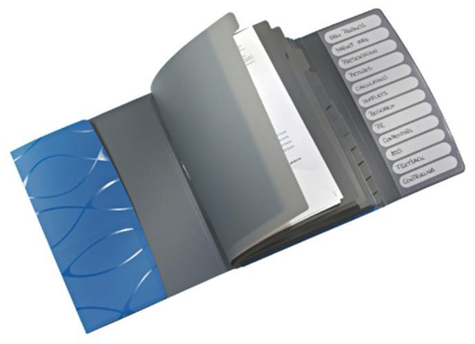 Na štýlovú organizáciu dokumentov. S atraktívnym kovovým uzáverom na bezpečné uschovanie obsahu S 3 chlopňami vzadu na ukladanie netriedených strán S vreckom na CD Formát A4 12 deliacich strán, odnímateľný register obsahu Farba Modrá