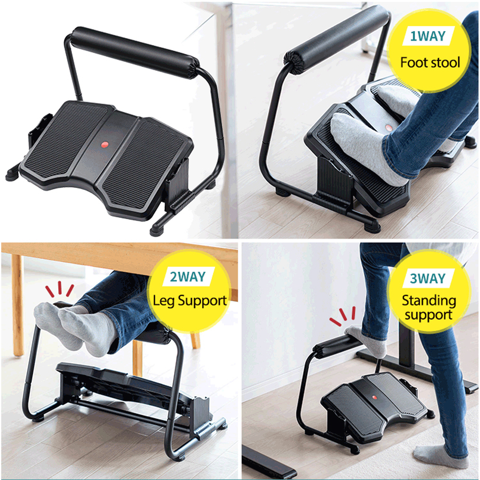 Praktická polohovateľná podpierka chodidiel s priebežnou reguláciou sklonu s veľkou plochou na nohy. Základný ergonomický doplnok k vášmu pracovnému stolu. Vďaka tejto pomôcke sedenie sa Vám veľmi spríjemní. V podstate nohy sú nadvihnuté, čím dochádza uvoľneniu tlaku na stehná. Výrazne to pomáha najmä krvnému obehu. Protišmyková úprava pre väčšiu stabilitu. Vyrobená z kovu a pevného plastu. Farba: Čierna Rozmery: 480 x 300