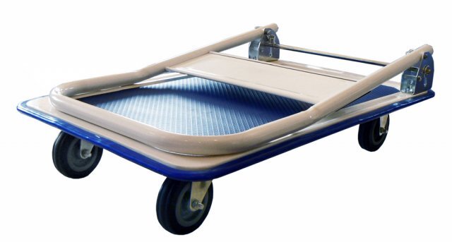 Celokovový vozík s gumovými kolesami. Má dve pevné a 2 otočné riadiace kolesá. Plastová hrana okolo plošiny chráni pri narazení napr. steny pred poškodením atď. Plocha plošiny je potiahnutá protišmykovou gumou. Má sklápateľnú rukoväť s aretáciou v zloženom i rozloženom stave. Nosnosť vozíka 150 kg. Plocha plošiny 73 x 48 cm. Priemer kolieska 10 cm. Váha vozíka cca 12 kg.