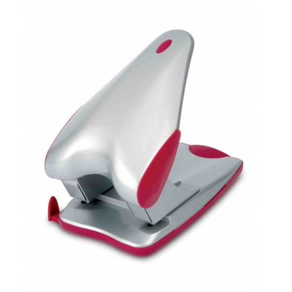 Celokovová veľkokapacitná dierovačka s plastovým dnom, ktorý slúži aj ako zásobník na odrezky. Kapacita dierovania 60 listov. Posuvné pravítko s príložníkom na štandardné formáty. Rozpätie dier 8 cm. Farba šedá / vínovo červená