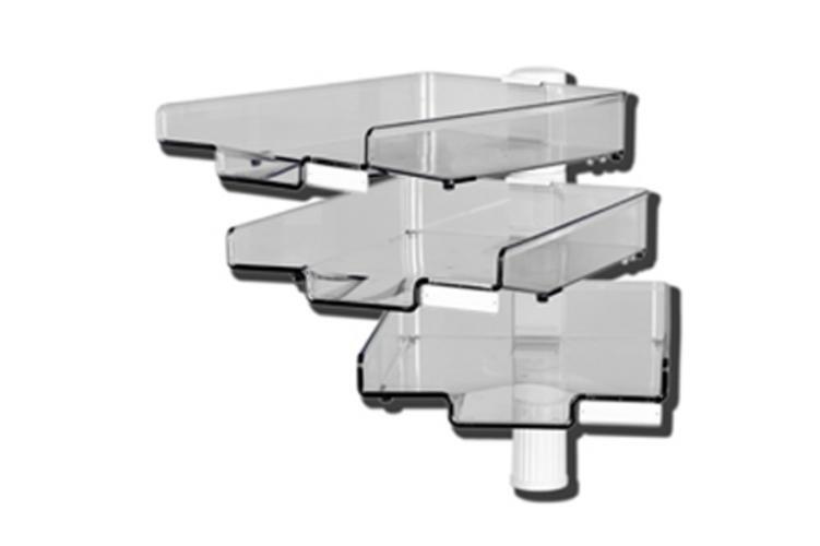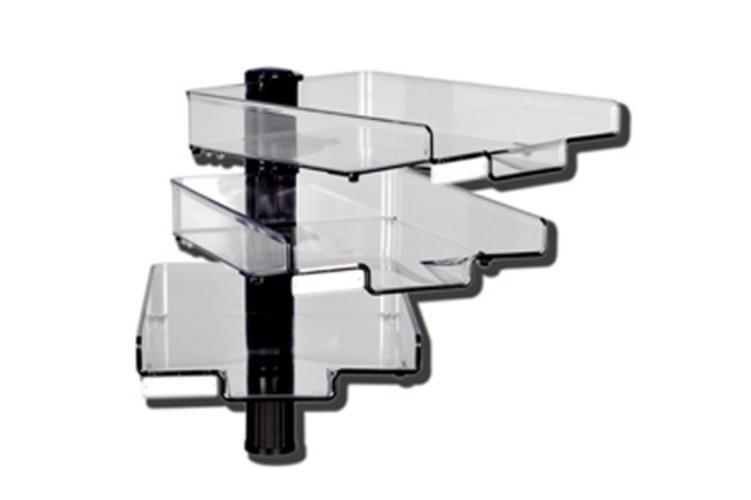 Uchytenie k pracovnej doske stola (hrúbka 16 - 65 mm) pomocou svorky. Misky na dokumenty A4 nosnosti 2,5 kg sa samostatne otáčajú o 360°. Misky sú transparentné, štítky na označenie s vymeniteľnými kartičkami sú súčasťou dodávky. Rozmer misky je 24 x 34 cm. Zavesujú sa zadnou stranou alebo bokmi do držiakov, ktoré sú upevnené na stabillnej hriadeli. Výška prvej misky nad pracovným stolom je 15 cm.