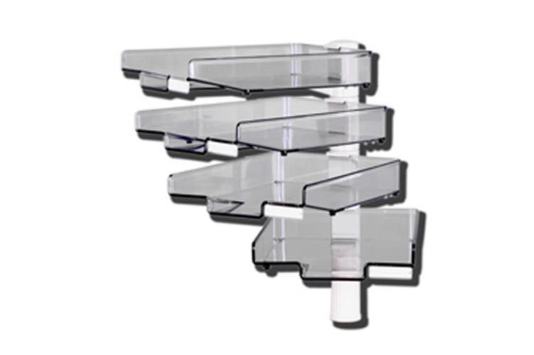 Uchytenie k pracovnej doske stola (hrúbka 16 - 65 mm) pomocou svorky. Misky na dokumenty A4 nosnosti 2,5 kg sa samostatne otáčajú o 360°. Misky sú transparentné, štítky na označenie s vymeniteľnými kartičkami sú súčasťou dodávky. Rozmer misky je 24 x 34 cm. Zavesujú sa zadnou stranou alebo bokmi do držiakov, ktoré sú upevnené na stabillnej hriadeli. Výška prvej misky nad pracovným stolom je 15 cm.