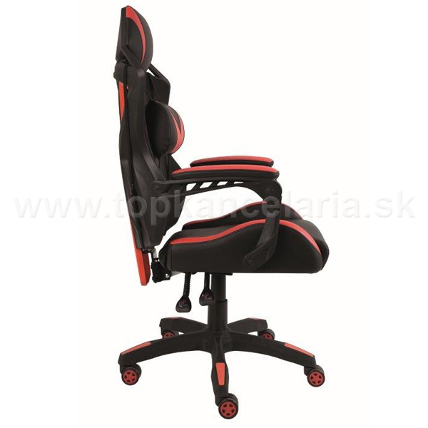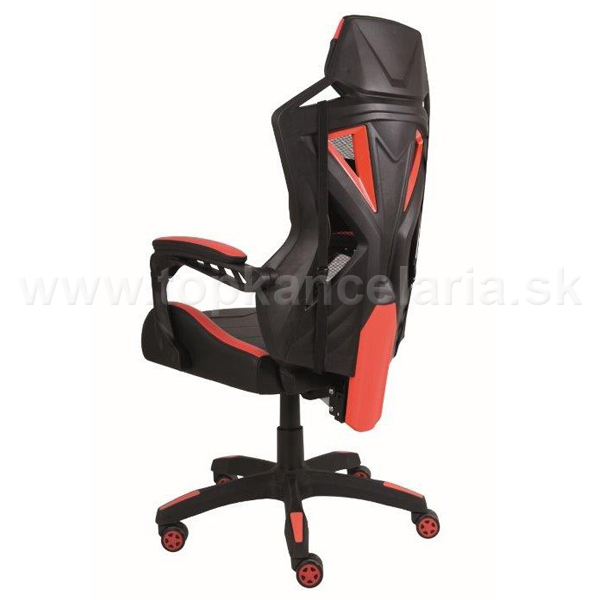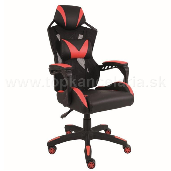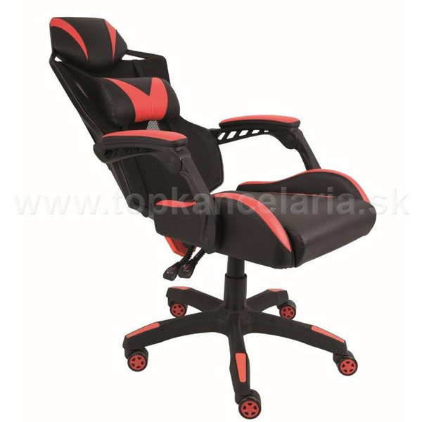 Veľmi pohodlné hráčske kreslo pre dlhé sedenie, pohodu a komfort. Má fixné sieťované operadlo s podhlavníkom a s výškovo nastaviteľnou bedrovou opierkou. Operadlo je možné blokovať v ktorejkoľvek polohe. Ergonomicky tvarované sedadlo potiahnuté s čiernou látkou, opierky rúk potiahnuté červenou koženkou, synchrónna mechanika s nosnosťou až 120kg, nylónový čierny kríž pr. 64cm. Univerzálne kolieska s priemerom 60 mm majú dizajn automobilových kolies, Váha stoličky 18kg