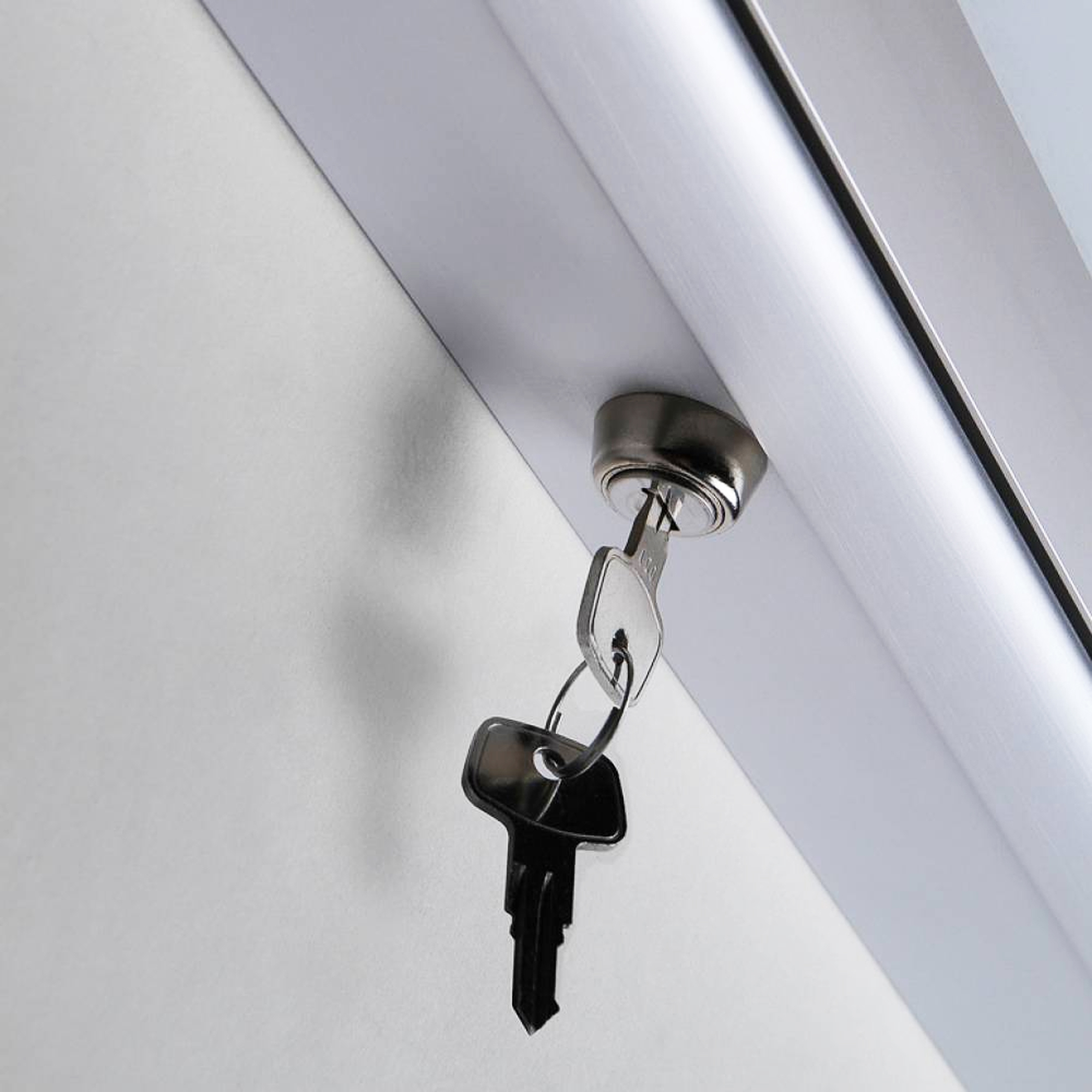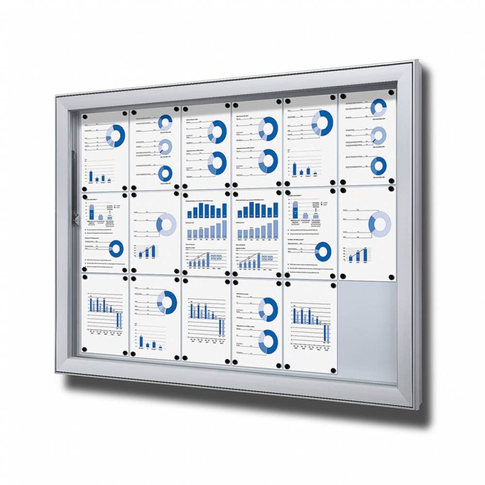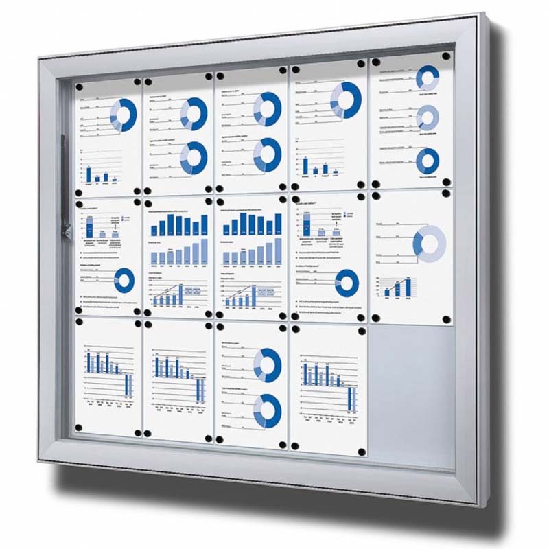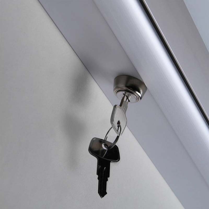 Robustná exteriérová vitrína s kapacitou 8×A4 je vyrobená zo strieborne eloxovaného hliníka, ktorý dodáva konštrukcii aj dverám vysokú odolnosť a elegantný vzhľad. Sklenená výplň dverí je z bezpečnostného skla a vďaka osadenému gumovému tesneniu sú dvere dokonale vodeodolné. Zadná biela lakovaná magnetická stena umožňuje upevnenie dokumentov pomocou magnetov a je zároveň popisovateľná popisovačmi na biele tabule, čo robí vitrínu praktickým a všestranným riešením pre vonkajšie využitie.