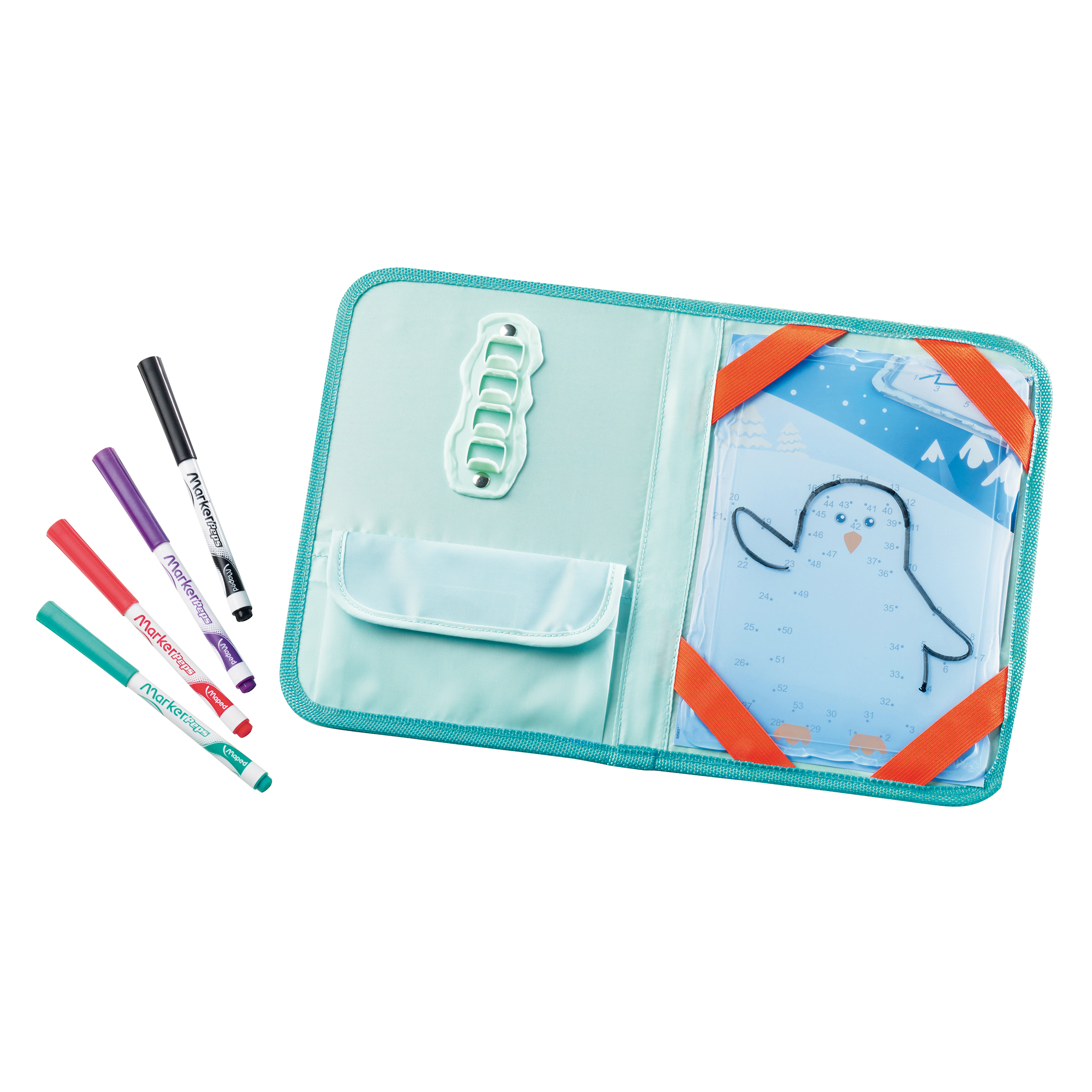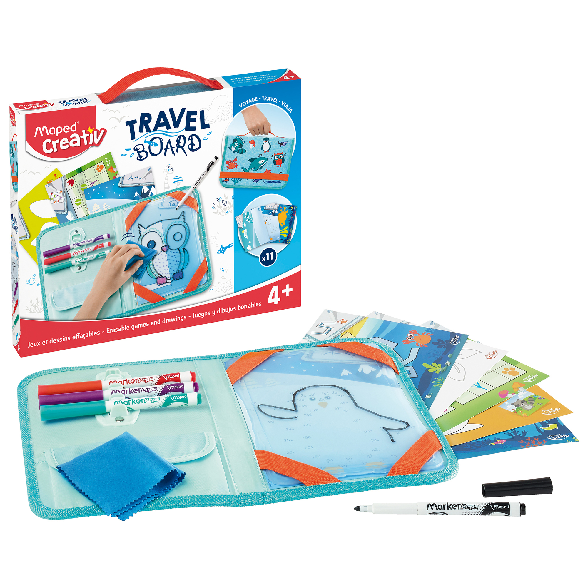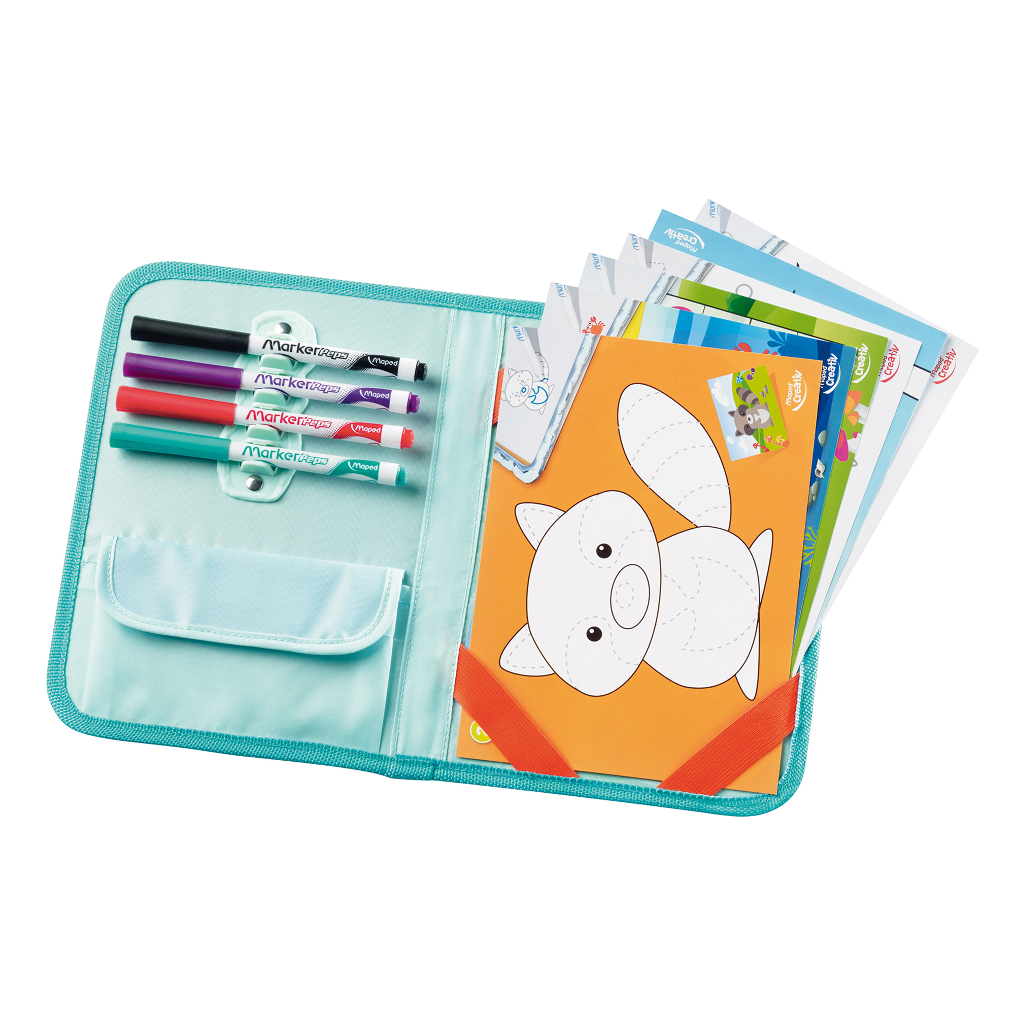 Cestovný kufrík, Hry a kreslenie so zvieratkami je ideálnym spoločníkom pre malých umelcov, ktorí radi kreslia a maľujú. Obsahuje transparentnú tabuľku, 4 farebné fixky Marker´s Peps, 12 predlôh s rôznymi motívmi a handričku. Tento kufrík umožňuje deťom kresliť podľa predlôh, ktoré sú ľahko uchopiteľné, čo uľahčuje maľovanie. Fixky sú špeciálne navrhnuté tak, že sa dajú jednoducho zmaľovať a potom zotrieť, čo umožňuje deťom maľovať a vymýšľať stále znova a znova.