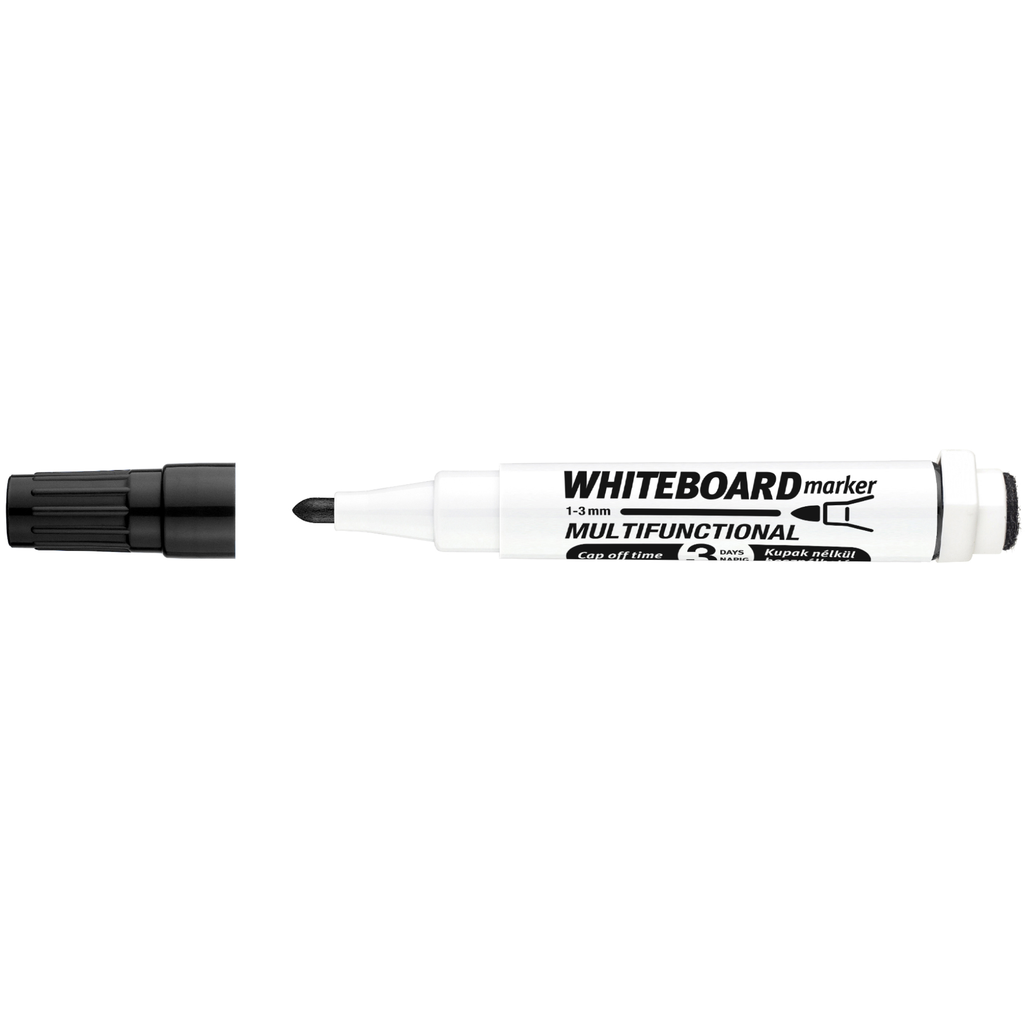 Za sucha stierateľný multifunkčný popisovač pre biele tabule. Zabudovaný magnet pevne drží popisovač na tabuli. Koniec popisovača je vybavený s filcom na malé opravy, korekcie. Bez viečka vydrží až 3 dni, pričom popisovač nestráca na kvalite - nevysychá. Stopa písania 1 - 3 mm. Stopa písma 1 - 3 mm. Vyrobené 30% recyklovaného materiálu. Väčšie balenie 10 ks.