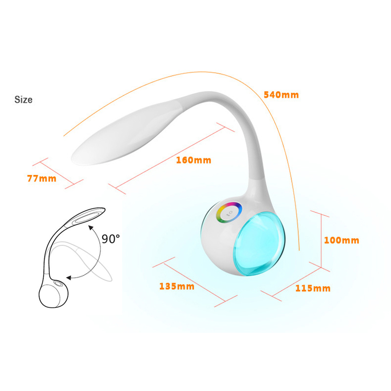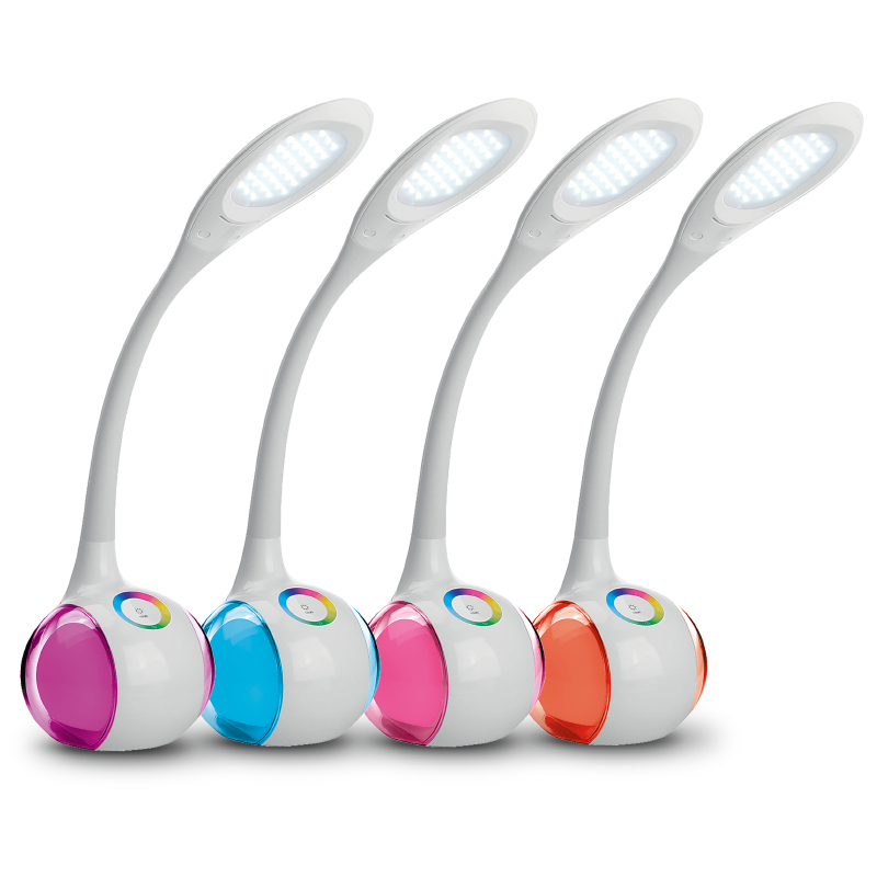 Led stmievateľná stolová lampa 6W s podsvietením základne 256 atmosferických farieb. Používa sa aj ako nočné svetlo. Možnosť voľby ľubovoľnej farby na svetelnej škále - manuálne ale má aj režim automatického prelínania farieb. Táto funkcia sa dá úplne vypnúť. Príkon podsvietenia základne 1,1W. Hlavný svetelný zdroj 300lm má teplotu svetla neutrálnu bielu 4100K so 3 stupňovým stmievaním. Protišmyková základňa s ohybným ramenom a hlavou. Vyrobený z bieleho lesklého ABS plastu. Dlžka napájacieho kábla 120cm. Led zdroj nemožno meniť. Energetická trieda A+. Rozmery: 540 x 160 x 130mm