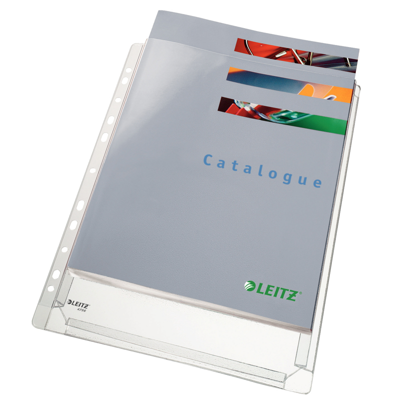 Závesné prospektové euroobaly Leitz A4 s rozšírenou kapacitou a s chlopňou. Vďaka veľkej kapacite sú zvlášť vhodné na zakladanie katalógov, cenníkov a objemnejších dokumentov. Vyrobené z pevného hrubého polypropylénu hrúbky 170 mikrónov kvôli dlhej životnosti, hladký povrch. Spodný a bočný klin o šírke 20 mm zvyšuje kapacitu obalu, otvorené spodné rohy obalov zabezpečia, že sa rohy vašich objemnejších dokumentov v obale neohnú a nezničia. Multiperforácia je zosilnená bielym plastovým prúžkom a je vhodná na založenie obalu do pákového aj krúžkového zakladača. Formát A4 s chlopňou. Kapacita obalu až 200 listov 80g/m2. Vyrobené z pevného hladkého PVC hrúbky 170mic. Balenie sáčok 5ks.