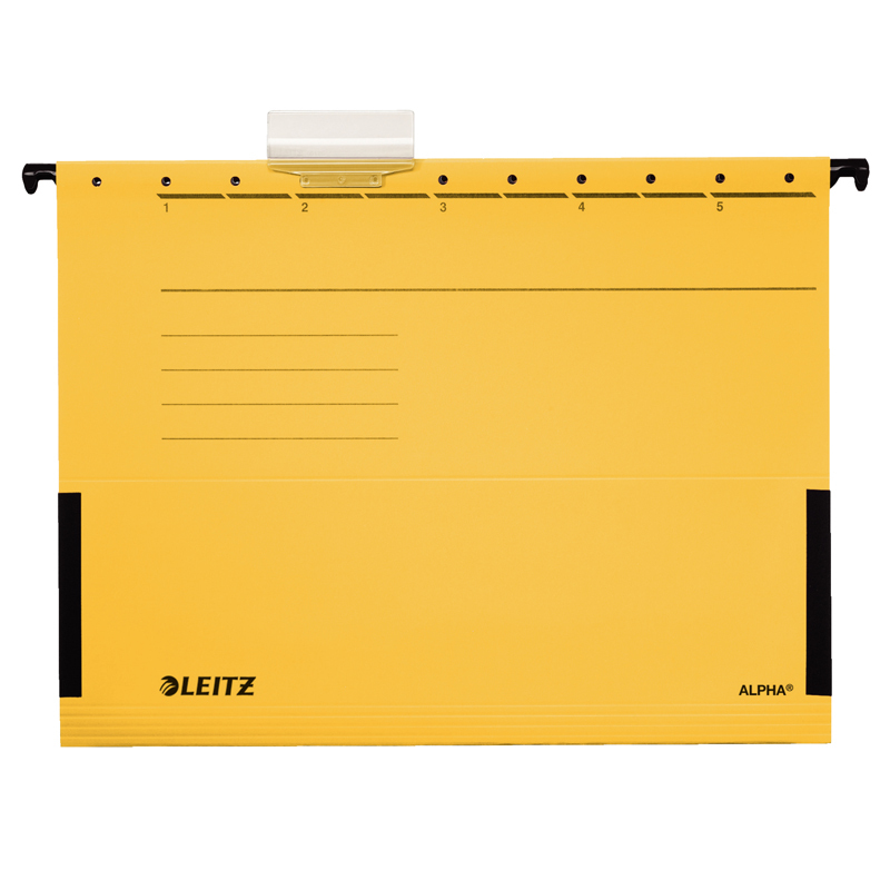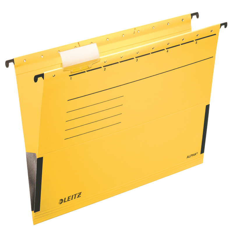 Vysoko kvalitný závesný obal v žltej farbe zo silnými a odolnými závesnými lištami a s veľkou nosnosťou. Vyrobený z pevného 250g kartónu Natron. Boky závesného obalu sú otvorené, vhodné pre voľné vkladané nedierovaných papierov formátu A4. Výrezy na závesnej lište pre dodatočné upevnenie rýchloviazacej spony (nie je súčasťou balenia). Súčasťou závesného obalu je aj rozlišovač s vymeniteľným štítkom pre popis obsahu. Vyrobené zo 100% recyklovaného kartónu. Rozmery: 348 x 260 x 0 (mm)