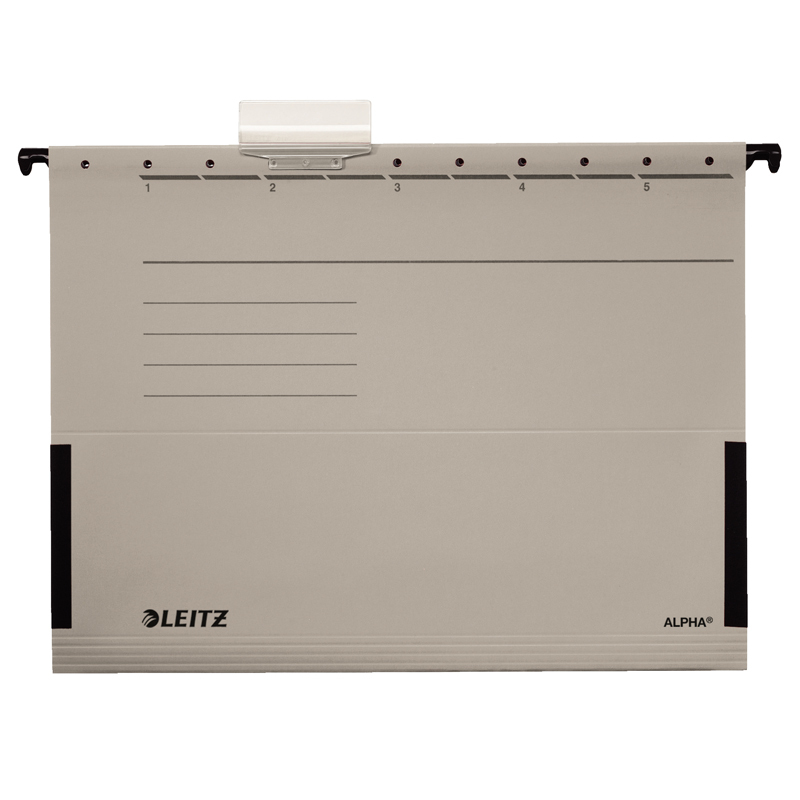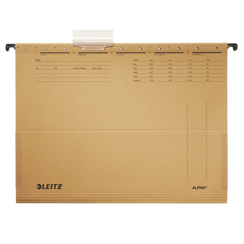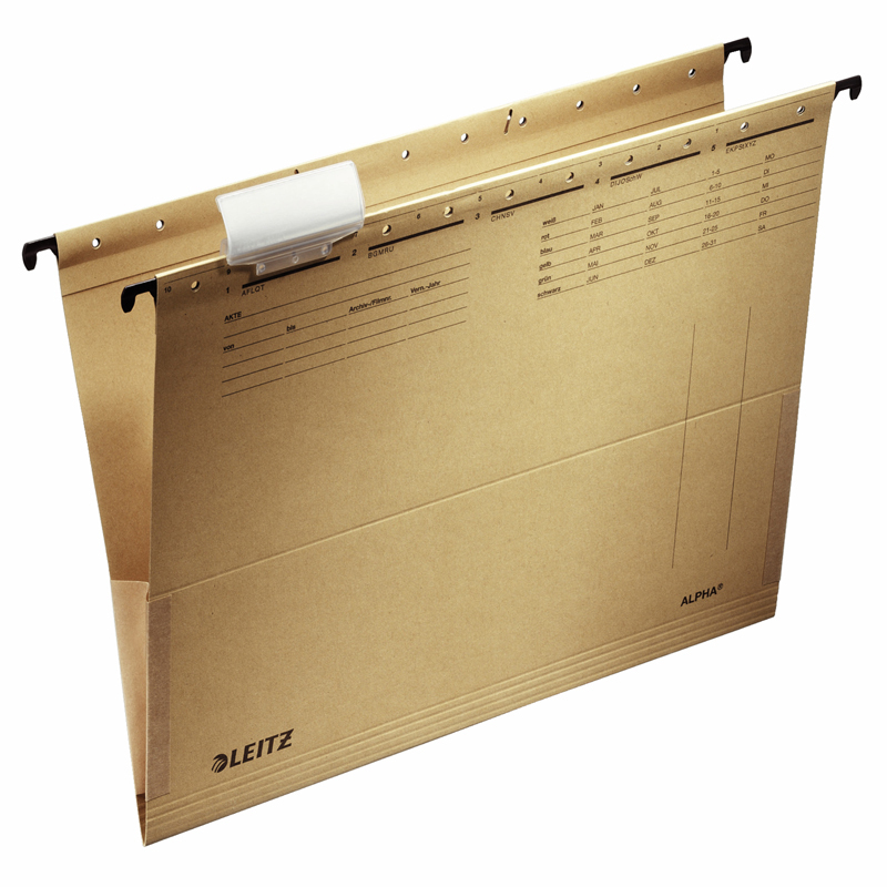 Vysoko kvalitný závesný obal vo farbe natúr, po stranách uzavreté s bočnicami. Obal je vybavený zo silnými a odolnými závesnými lištami a s veľkou nosnosťou. Bočnice chránia voľné dokumenty pred vypadnutím z dosiek. Výrezy na závesnej lište pre dodatočné upevnenie rýchloviazacej spony (nie je súčasťou balenia). Súčasťou závesného obalu je aj rozlišovač s vymeniteľným štítkom pre popis obsahu. Vyrobené zo 100% recyklovaného kartónu. Certifikované Modrým Anjelom (Blue Angel). Rozmery: 348 x 260 x 0 (mm)