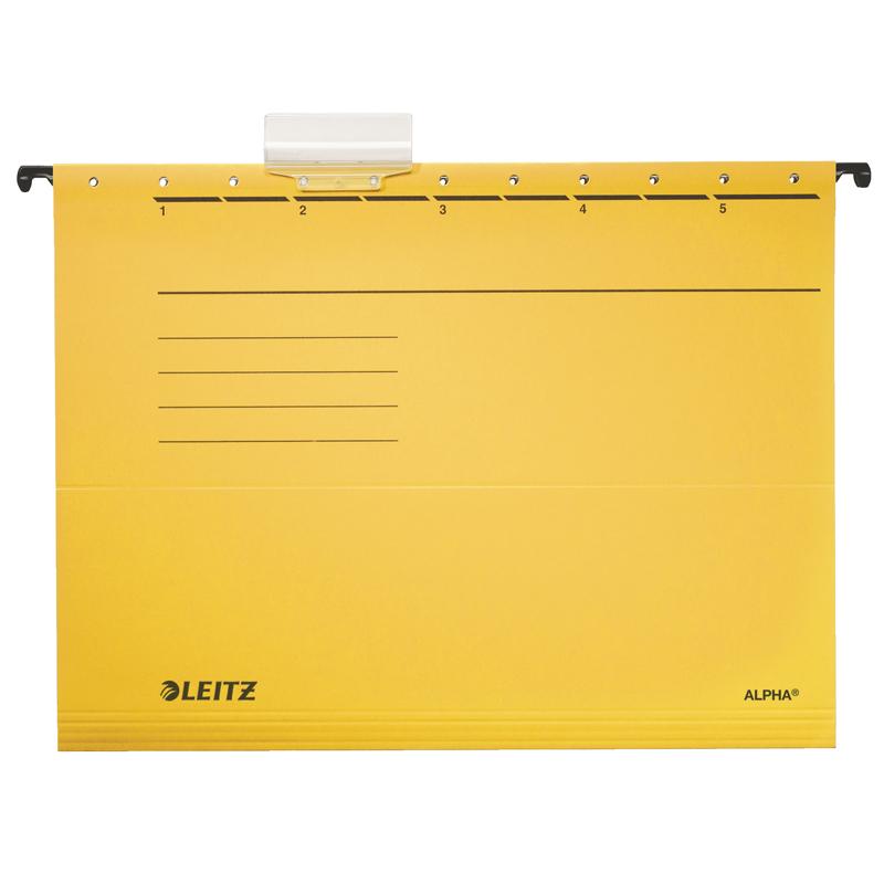 Vysoko kvalitný závesný obal v žltej farbe zo silnými a odolnými závesnými lištami a s veľkou nosnosťou. Vyrobený z pevného 250g kartónu Natron. Boky závesného obalu sú otvorené, vhodné pre voľné vkladané nedierovaných papierov formátu A4. Výrezy na závesnej lište pre dodatočné upevnenie rýchloviazacej spony (nie je súčasťou balenia). Súčasťou závesného obalu je aj rozlišovač s vymeniteľným štítkom pre popis obsahu. Vyrobené zo 100% recyklovaného kartónu. Rozmery: 348 x 260 x 0 (mm)
