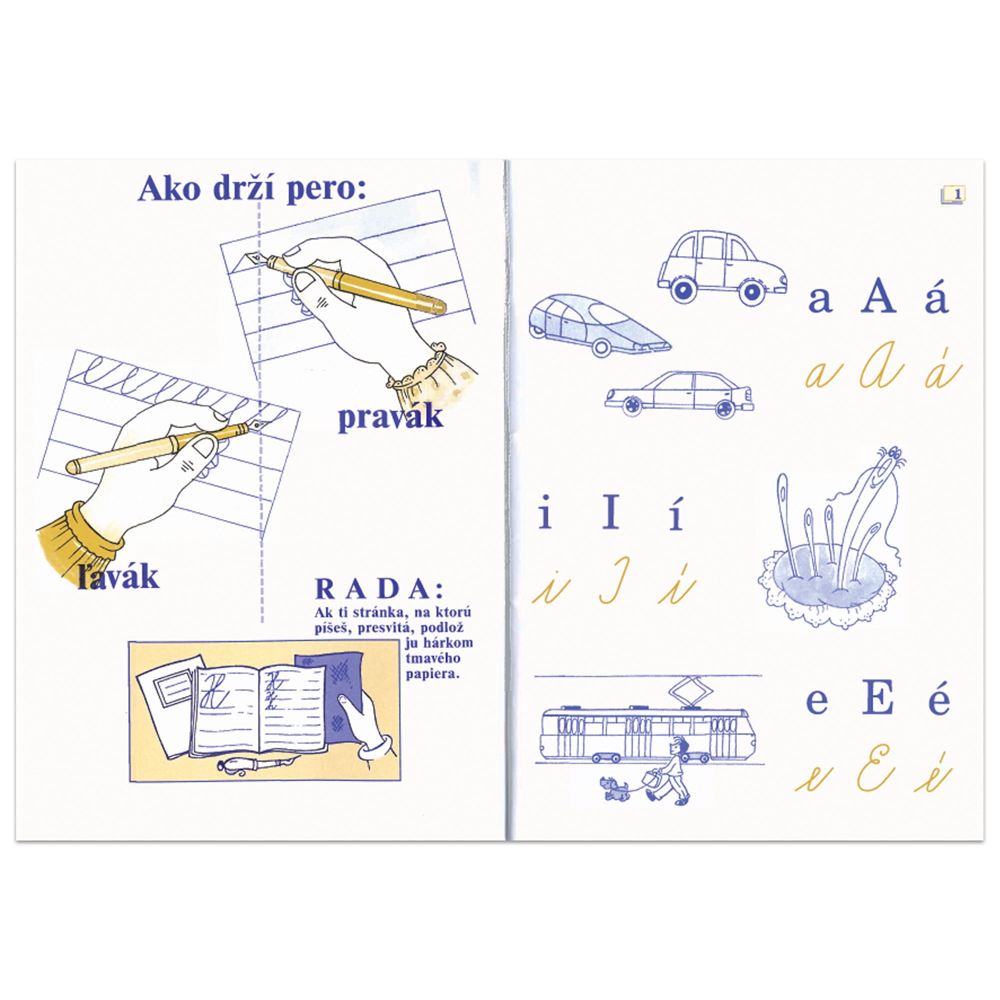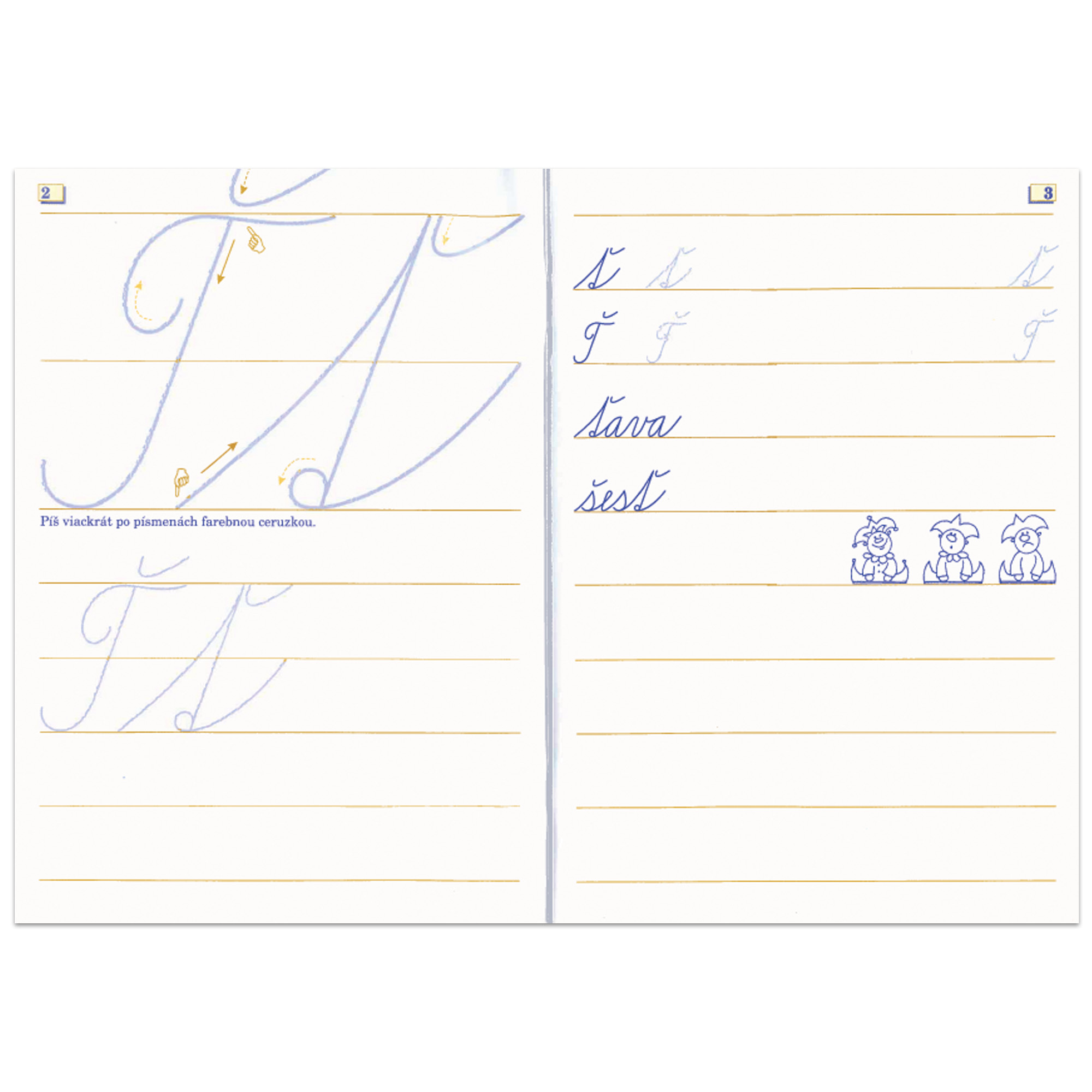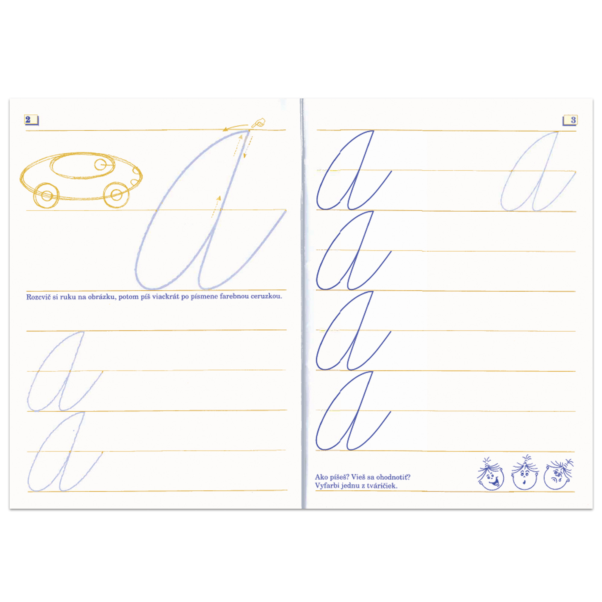 Vyvodzovacia strana s novým písmenkom obsahuje motivačnú ilustráciu, ktorá slúži na rozcvičenie zápästia. Učiteľ ju môže využiť na vyfarbovanie aj v prípade, ak potrebuje efektívne „zabaviť“ rýchlejších žiakov. Na vyvodzovacej strane nájdete nové písmeno v písanej forme v rôznych veľkostiach, ako aj obrázky na sebahodnotenie žiakov.