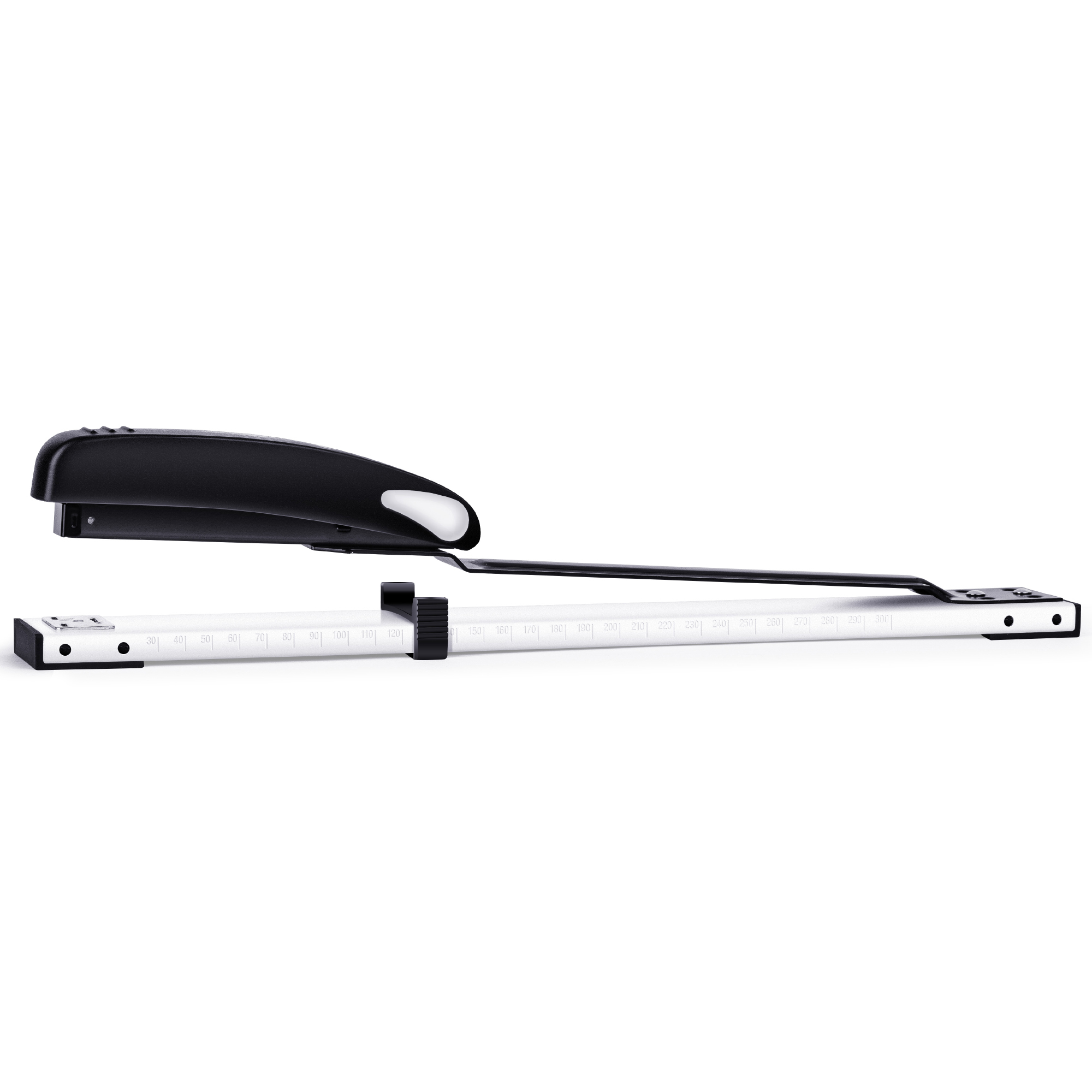 Celokovová zošívačka s predĺženým ramenom s posuvným plastovým dorazom. Hĺbka vkladania až 314 mm. Výkon zošívania 50 listov. Používa spinky 24/6 a 26/6, kapacita zásobníka 100 spiniek. .Záruka 5 rokov