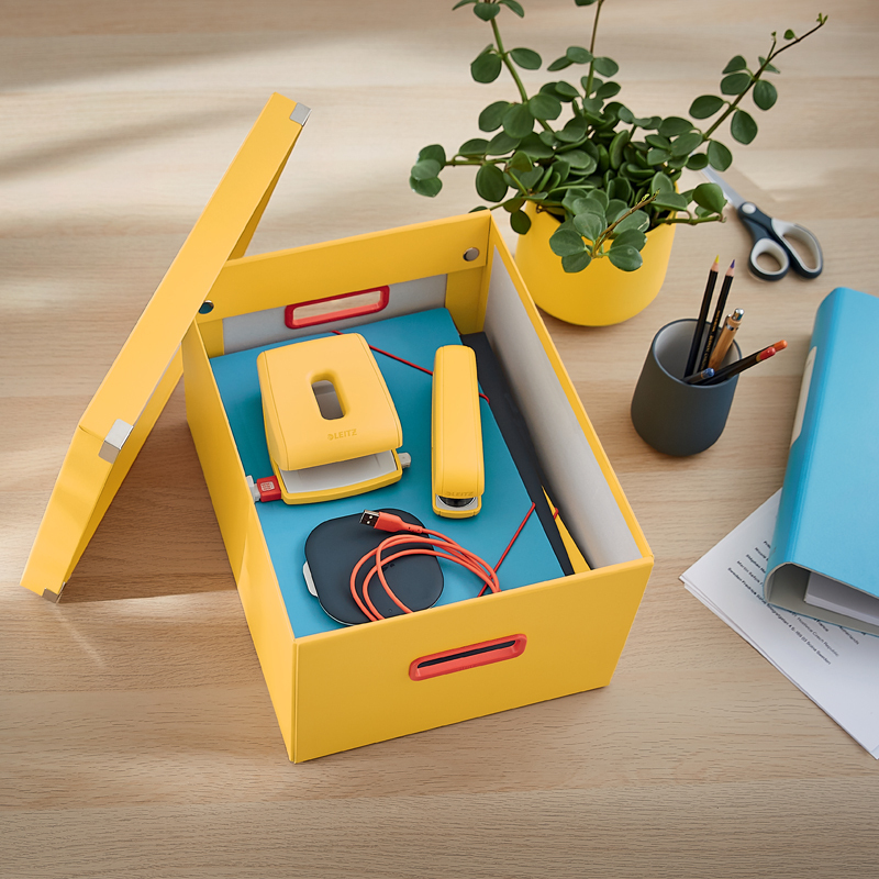 Atraktívna skladacia škatuľa Click & Store COSY univerzálnej veľkosti s vekom vhodná na ukladanie dokumentov, albumov, zakladačov a pod. až do veľkosti A4. Rýchle a jednoduché skladanie/rozkladanie pomocou patentov. Rozloženú škatuľu je možné umiestniť do veka a šetriť tak miesto. Má štýlové červené otvory na pohodlné uchopenie pri zdvíhaní a prenášaní. Prémiová kartónová škatuľa Leitz Cosy Click & Store je ideálna na udržiavanie poriadku doma i v kancelárii a pomáha vám rýchlo a jednoducho si zorganizovať prácu. Vďaka minimalistickému dizajnu a príjemným matným farbám môžete svojmu pracovnému priestoru pridať štýl a farbu. Kolekcia Leitz Cosy kombinuje komfort domáceho pohodlia s prvotriednou kvalitou a vytvára tak pozitívne a produktívne pracovné prostredie. Vyrobené z pevného vysokokvalitného kartónu pre dlhú životnosť, čistá, polomatná PP povrchová úprava. Váha 0,9 kg. Rozmery 281 x 200 x 370 mm.